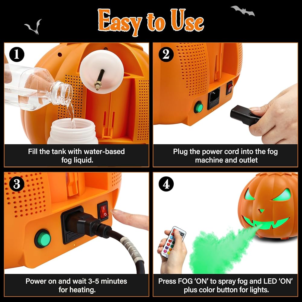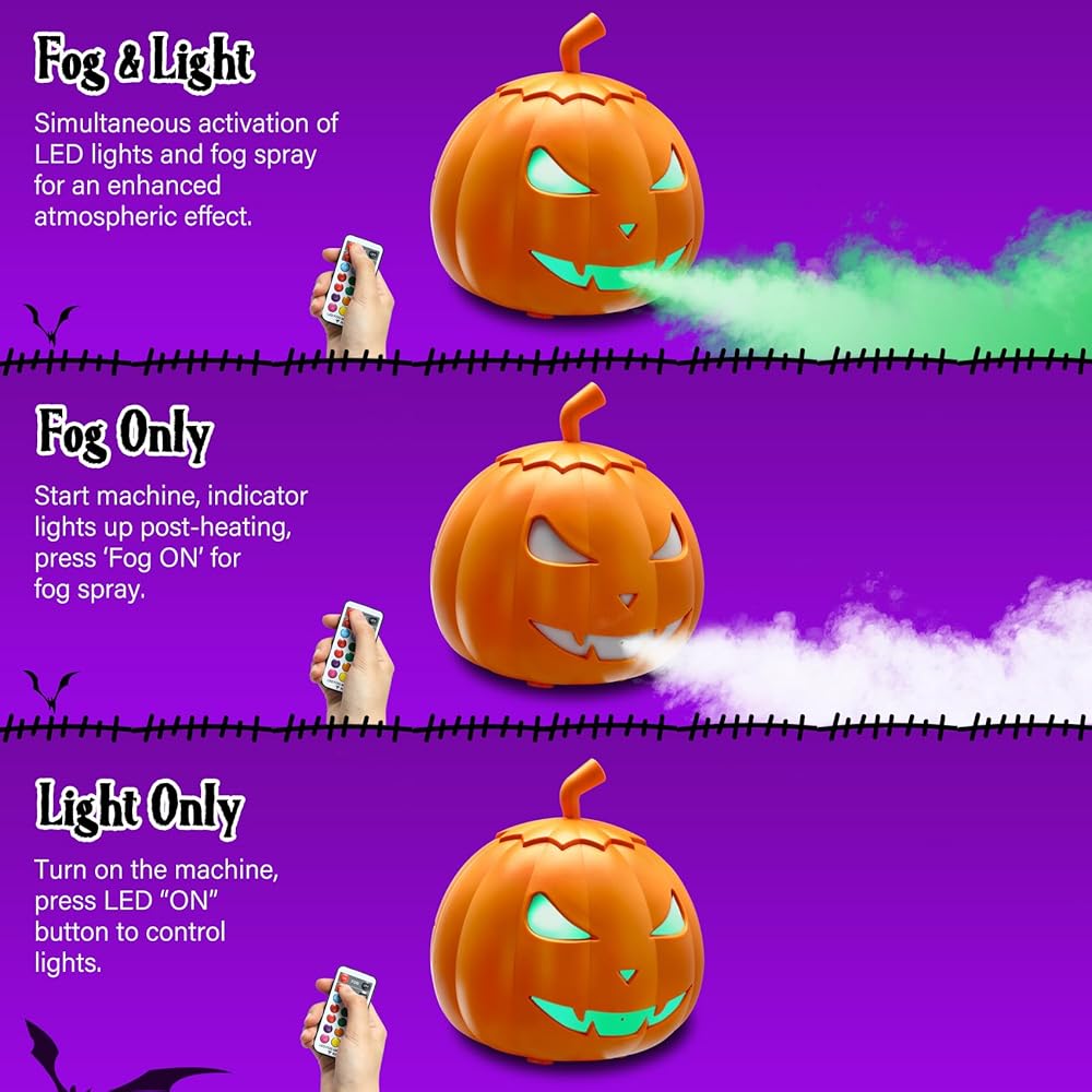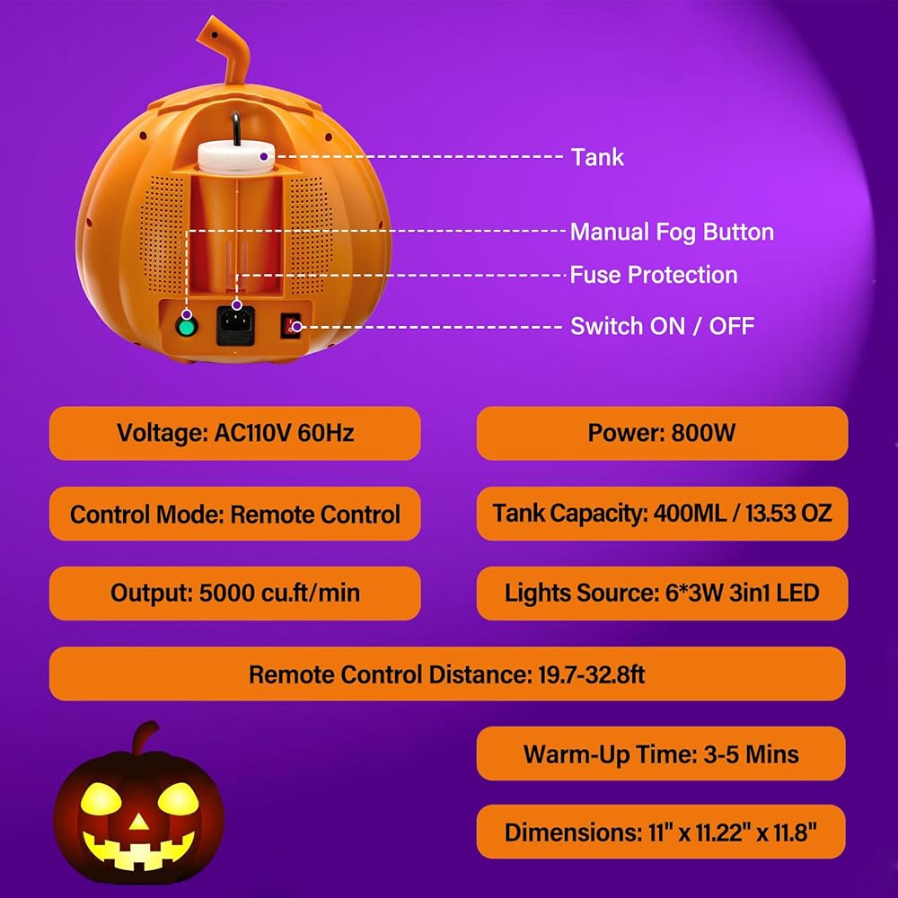 خلق جو مخيف: تضيف آلة الضباب على شكل اليقطين TCFUNDY لمسة غريبة إلى ديكور الهالوين الخاص بك. بفضل قوة 800 واط وإخراج 5000 قدم مكعب في الدقيقة، فإنه يغلف مساحتك بالضباب. بالإضافة إلى ذلك، استمتع بـ 12 لونًا ضوئيًا LED و3 تأثيرات ضوئية آسرة لتجربة مؤرقة حقًا!