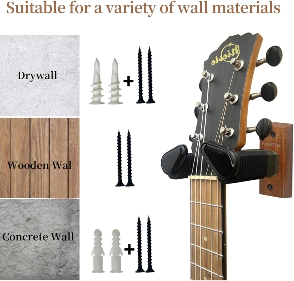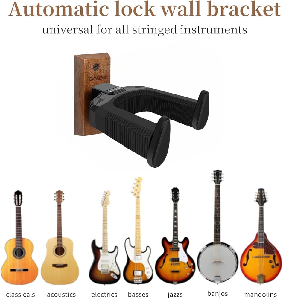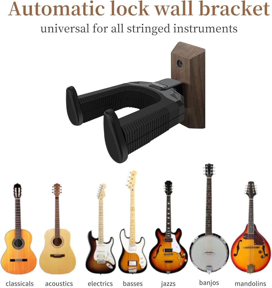 【توافق واسع للآلات】قم بتعليق الجيتار الخاص بك على الحائط بأناقة! سواء كان جيتارًا صوتيًا، أو جيتارًا كهربائيًا، أو جيتارًا جهيرًا، أو بانجو، أو جيتارًا جهيرًا، فإن حامل الجيتار الجداري هذا يوفر لك التغطية. حل عالمي لعرض أدواتك المفضلة بكل سهولة وأناقة.