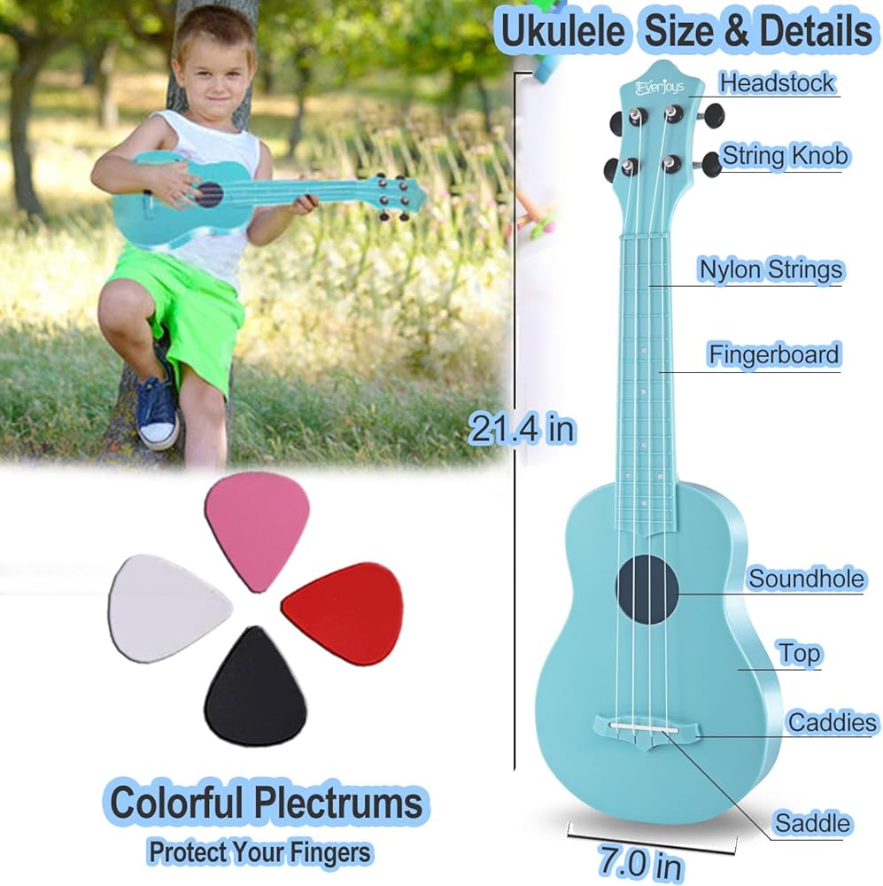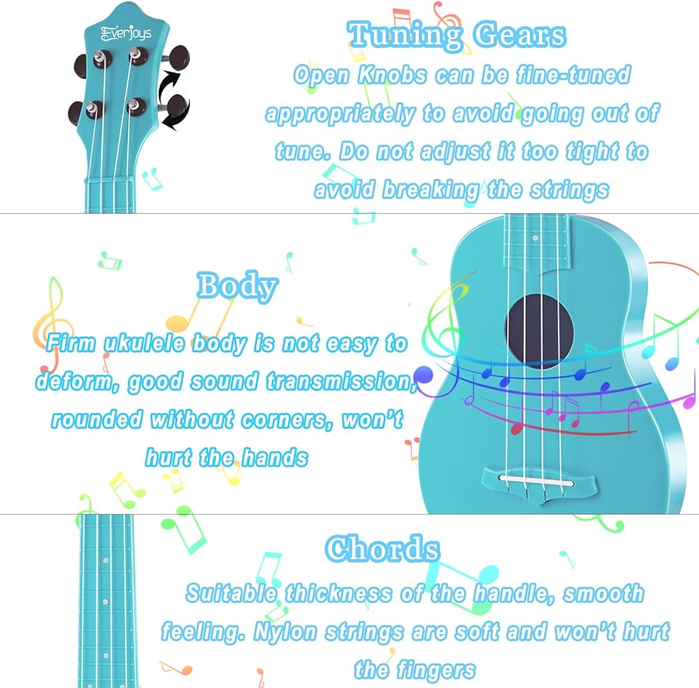 تشمل العبوة: مجموعة المبتدئين من Everjoys ukulele تتضمن قيثارة سوبرانو مقاس 21 بوصة، وحزام، وكتاب أغاني سريع التعلم، وأربع قطع احتياطية، وقطعة قماش تلميع من الألياف الدقيقة، وحقيبة ناعمة مريحة ومتينة، وعشرة ملصقات مضحكة وصندوق مطبوع.