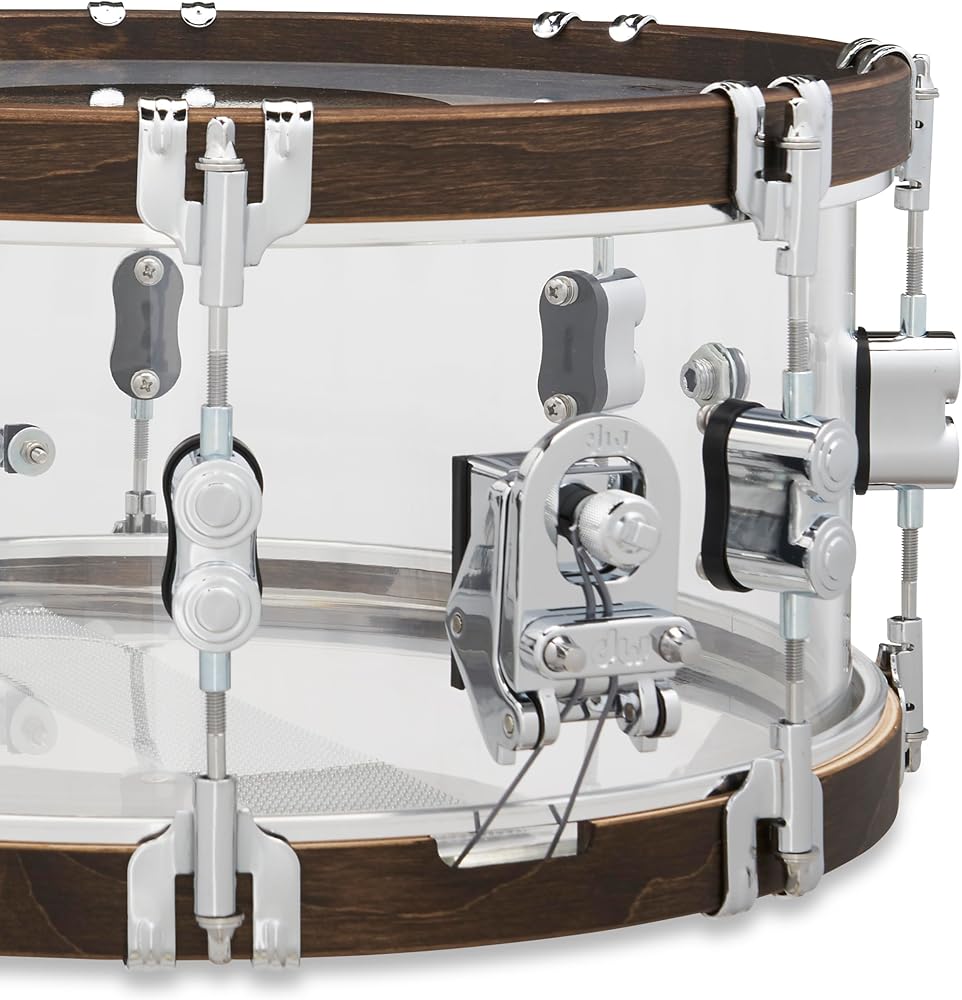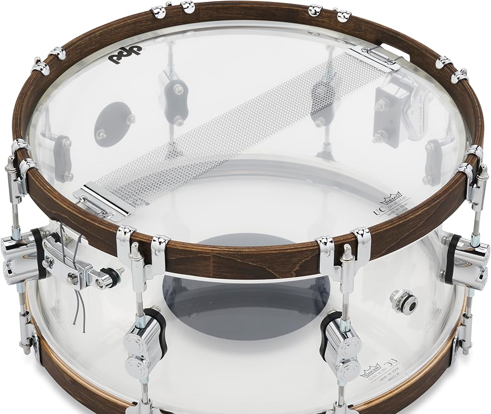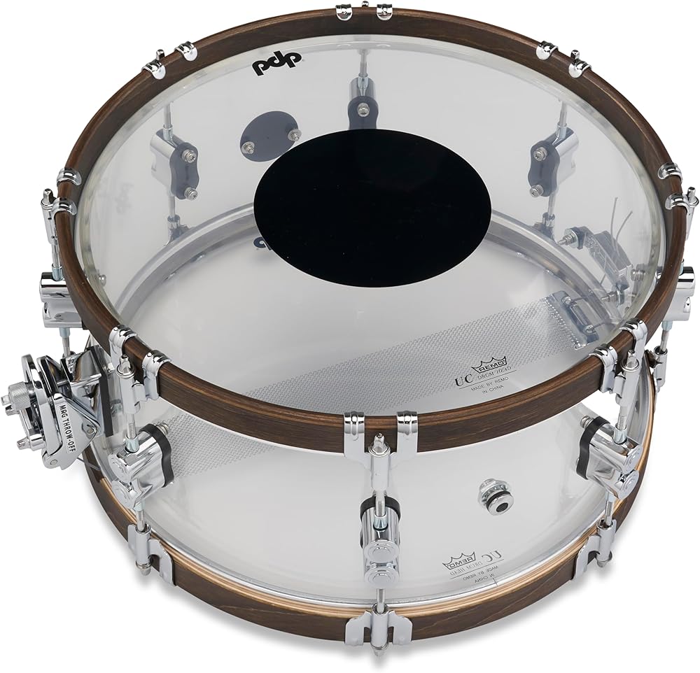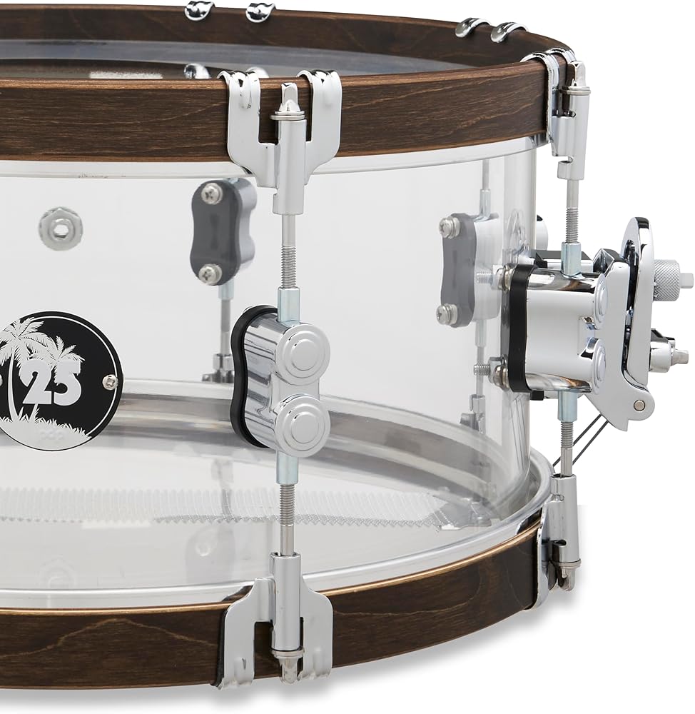 This Acrylic 6.5x14” snare celebrates the 25th Anniversary of PDP with a special fusion of seamless acrylic shells, walnut-stained hoops, and a commemorative badge. Acrylic shells have been a mainstay in popular music due to their appealing looks and their bright attack, focused tone, and controlled sustain. This seamless shell is fitted with walnut-stained wood hoops, which adds a throaty tonal element and slightly increases warmth. These drums are also fitted with DW's MAG throw-off, while True-Pitch tension rods offer more accurate and secure tuning. These drums are fitted with Remo heads. Available only in 2024.