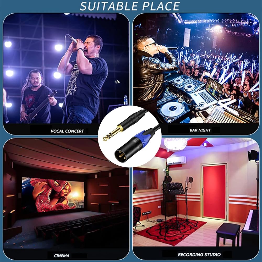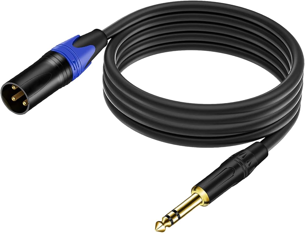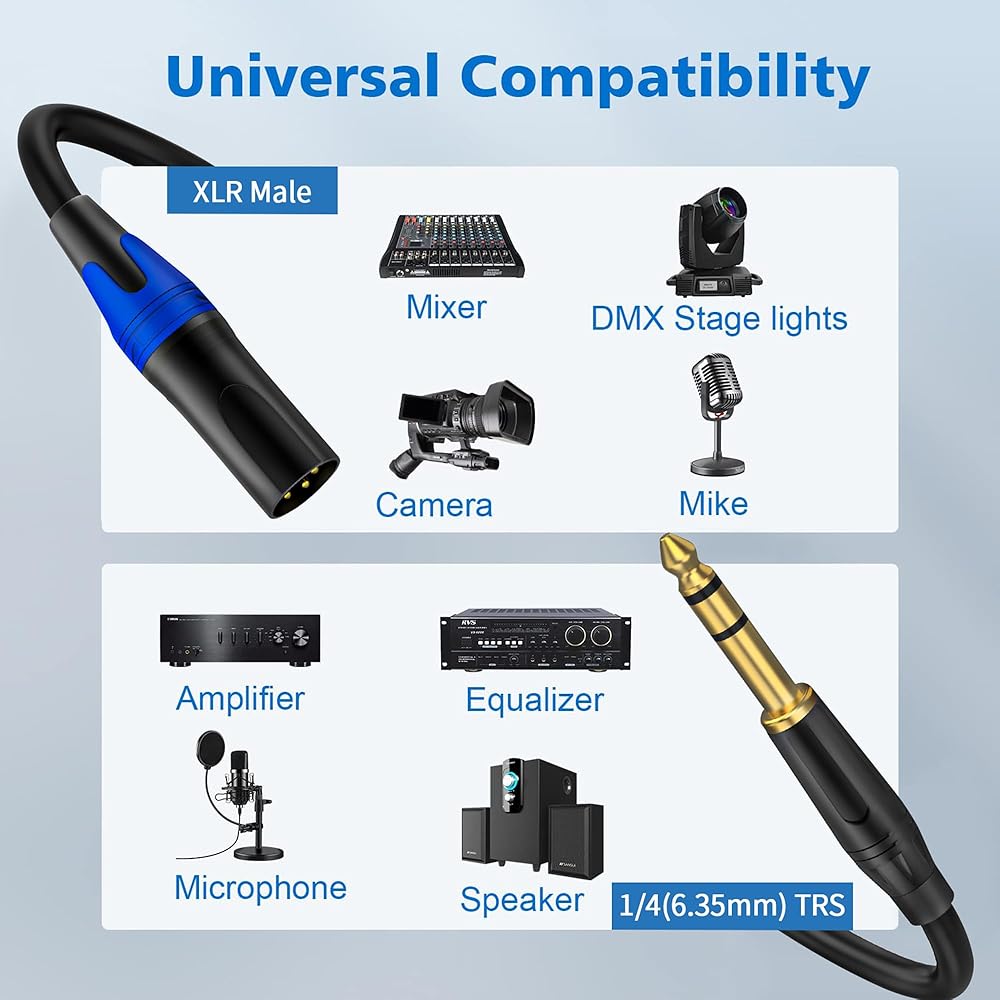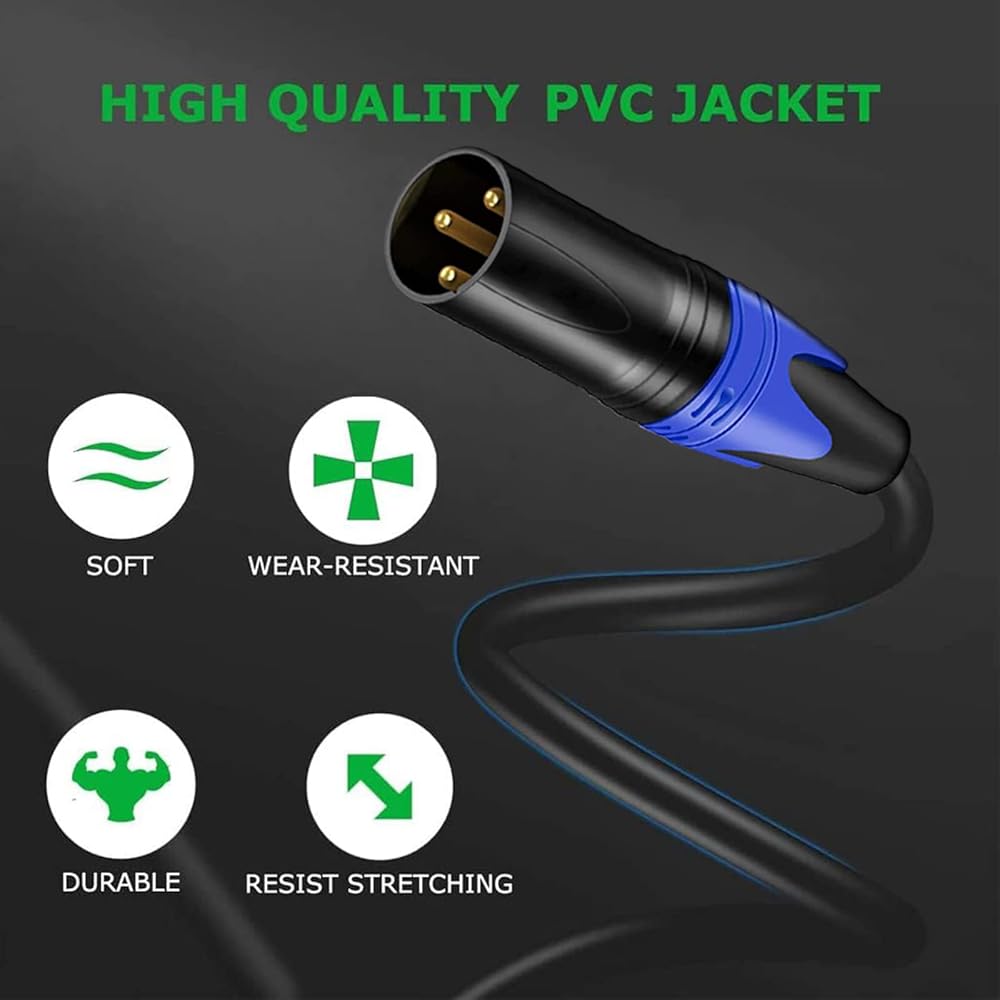 موصل XLR هو نوع محمي معدني عالي الجودة يتم تثبيته بشكل فعال في الميكروفون؛ يتميز موصل TRS عالي التحمل مقاس 6.35 مم بدواسة سهلة الإمساك بزاوية 360 درجة لفصل متكرر ومتانة. يتم توصيل دبوس XLR 1 بغطاء القابس 1/4 بوصة، ويتم توصيل دبوس XLR 2 بطرف القابس 1/4 بوصة، ويتم توصيل دبوس XLR 3 بحلقة التوصيل 1/4 بوصة. يستخدم كابل الصوت المتوازن موازنة المعاوقة خطوط لتقليل الضوضاء الكهرومغناطيسية والترددات اللاسلكية، ولتوسيع النطاق الفعال للكابل.