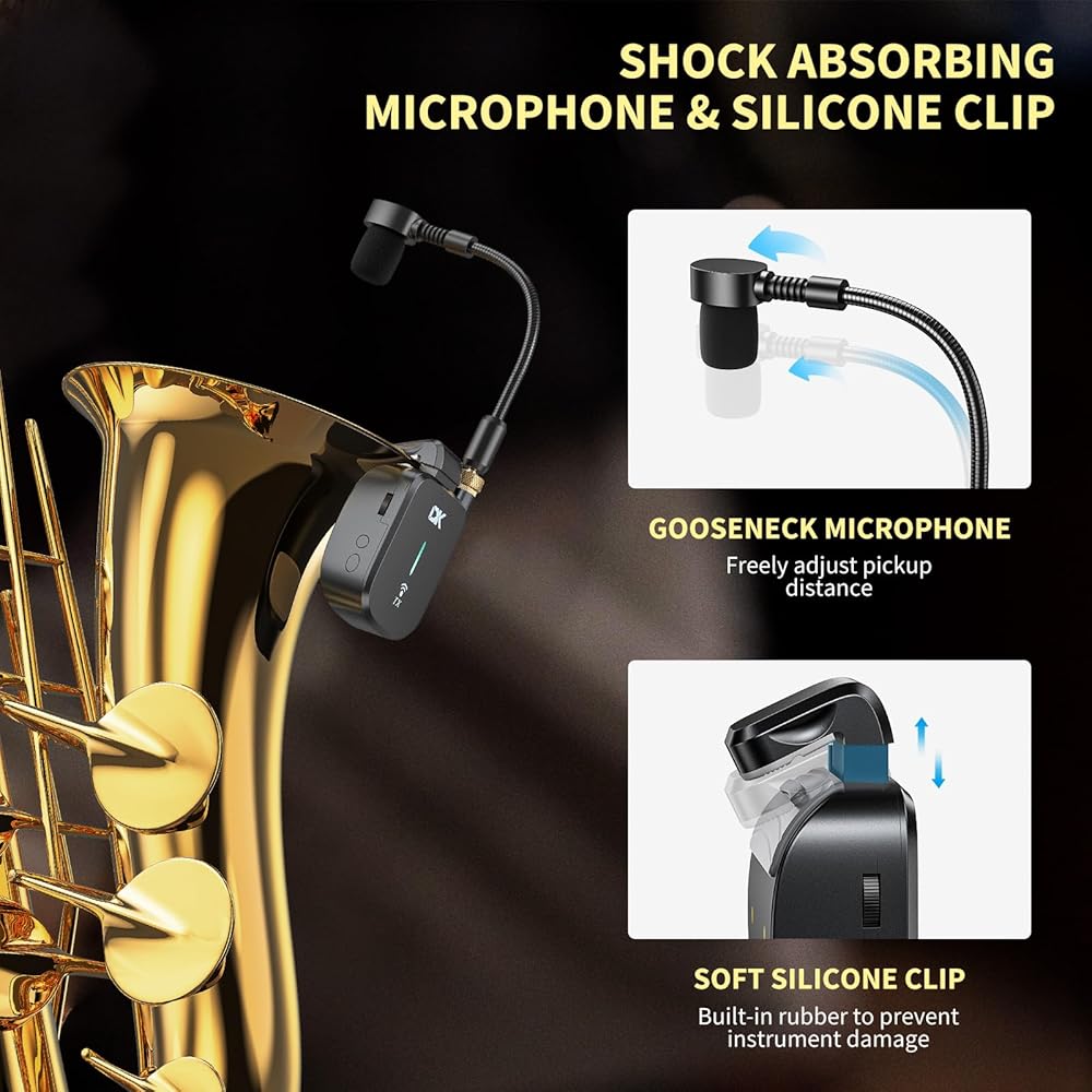 جهاز إرسال بمشبك: تم تجهيز الميكروفون ذو العنق المنحني عالي الحساسية بوظيفة امتصاص الصدمات من السيليكون، والتي يمكنها القضاء على الضوضاء البيئية بشكل فعال، والحصول على تسجيلات مثالية. بالإضافة إلى ذلك، يحتوي المشبك الخلفي لجهاز الإرسال على وسادة مطاطية يمكن تثبيتها بإحكام على الساكس دون إتلاف الجهاز
