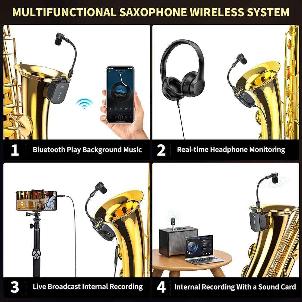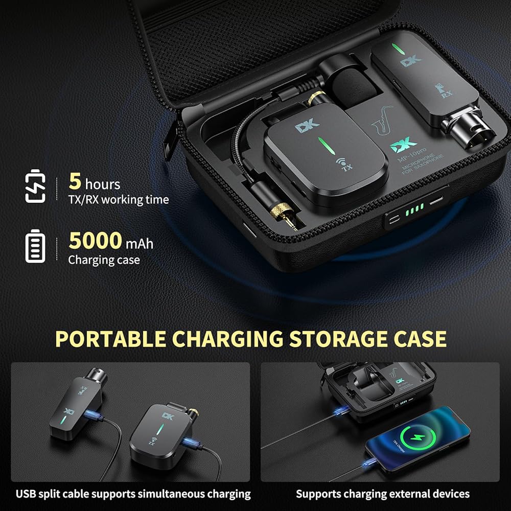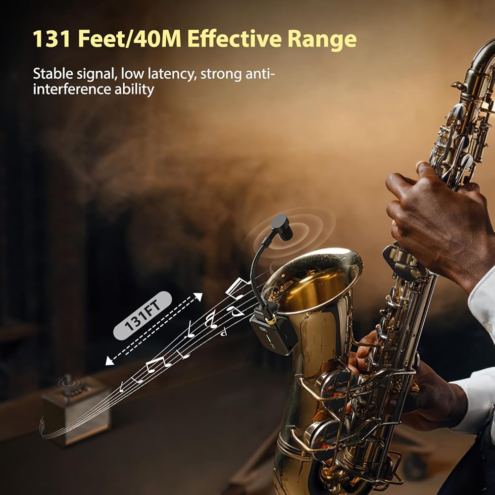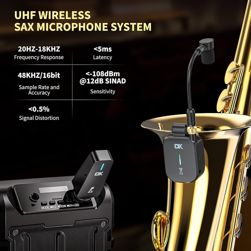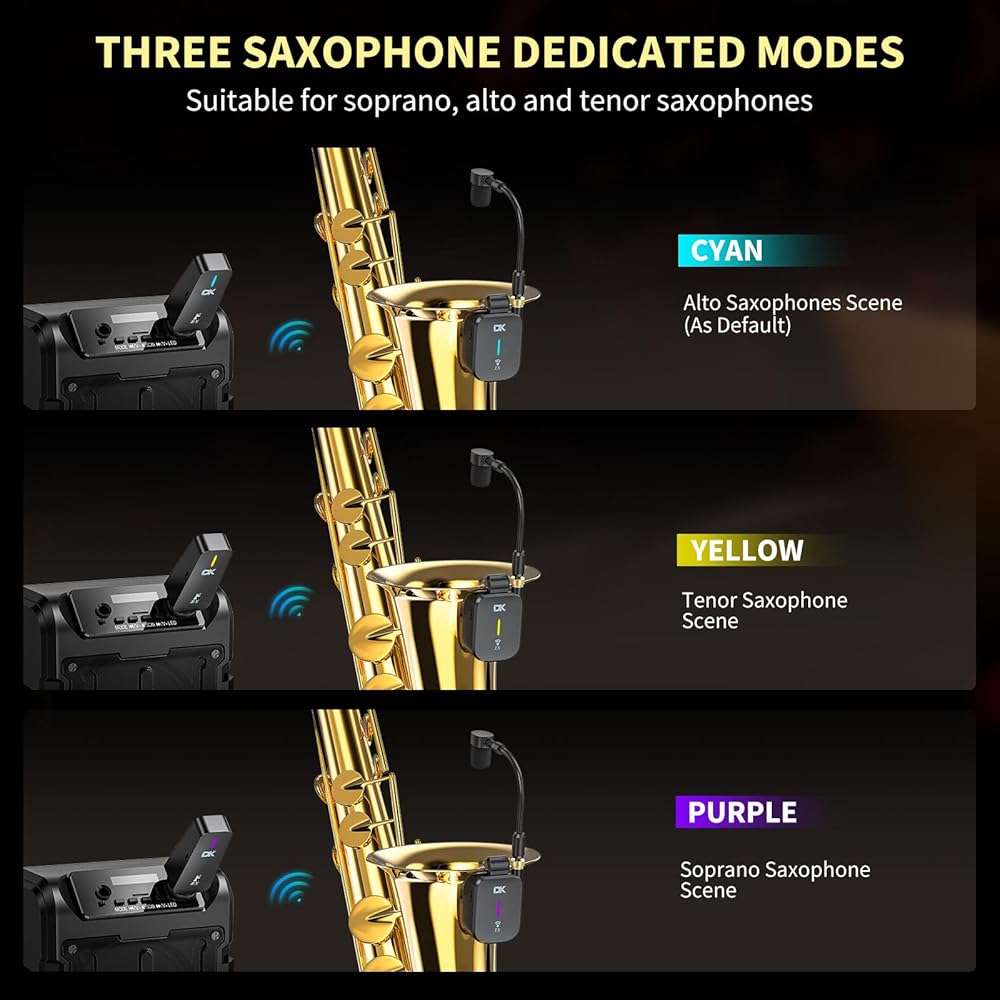 نظام ساكسفون لاسلكي UHF، ميكروفون أدوات متعدد الوظائف بمشبك مع حقيبة شحن، ثلاثة أوضاع مخصصة للساكس، ناقل حركة 131 قدم، قابل لإعادة الشحن، لسماعات الرأس للتسجيل/الشاشة