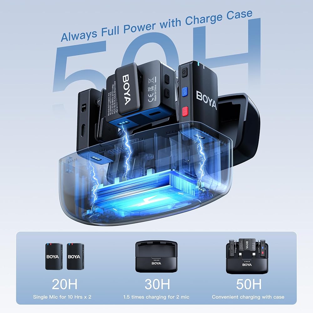 【حقيبة شحن طويلة الأمد】يتميز جهاز إرسال الميكروفون اللاسلكي بوقت تشغيل مثير للإعجاب يصل إلى 10 ساعات (حوالي 6 ساعات عند تنشيط التسجيل على اللوحة). يمكن شحن كل من جهاز الإرسال والاستقبال الخاص بميكروفون lav اللاسلكي بالكامل خلال 1.5 ساعة فقط. وتدعم علبة الشحن، التي تستغرق 2.5 ساعة للشحن، إعادة شحن الأجهزة 1.2 مرة لأجهزة الإرسال (2TX) ومرة واحدة لجهاز الاستقبال (1RX) مما يضمن الاستخدام الممتد والراحة