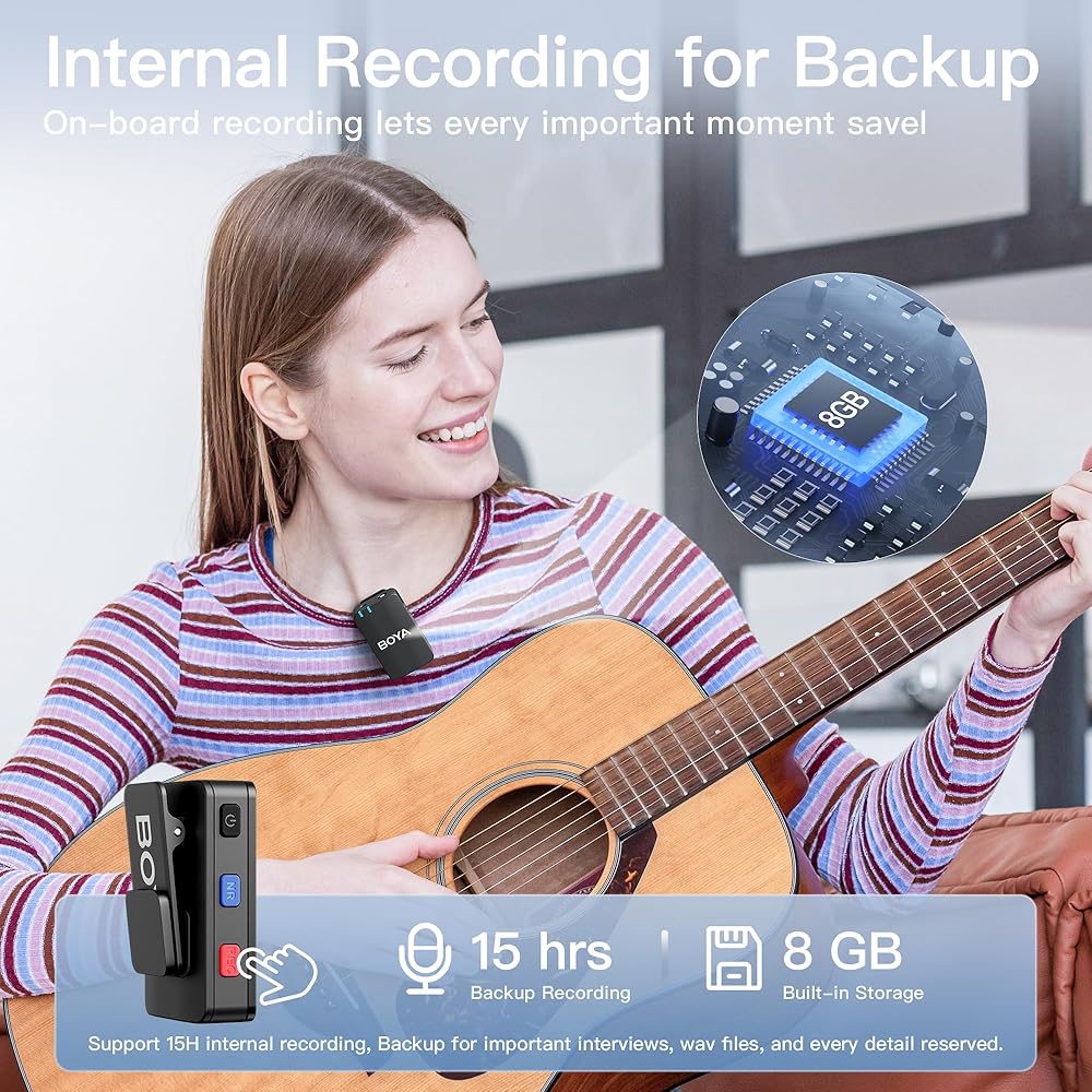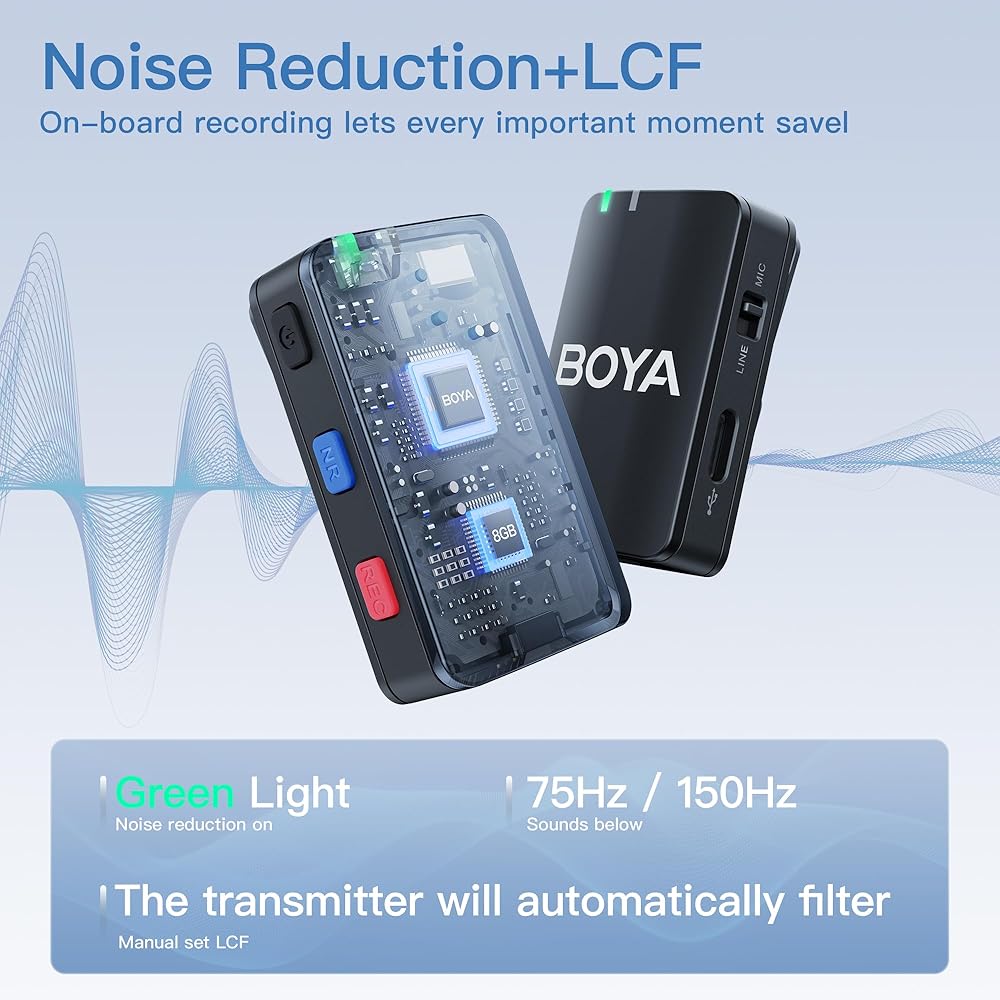 【تسجيل مستقل وتخزين 8 جيجابايت 】تسمح شريحة التخزين المدمجة بسعة 8 جيجابايت بما يصل إلى 15 ساعة من التسجيل. يتيح منفذ Type-C لجهاز إرسال الميكروفون اللاسلكي Boyamic نقل الملفات بسهولة إلى أجهزة الكمبيوتر والهواتف الذكية. اختر من بين ثلاثة أوضاع لتصدير الصوت: Mono، وStereo، وSafety Track. يتم دعم كسب الديسيبل (ديسيبل) بنقرة واحدة. تعرض شاشة OLED أوضاع التصدير ومستوى الصوت ومستويات البطارية وحالة الاتصال وإلغاء الضوضاء والمزيد