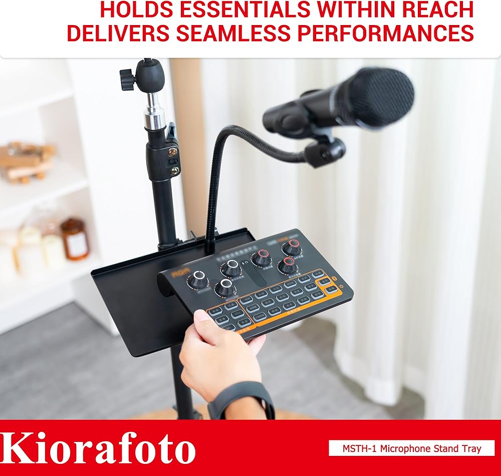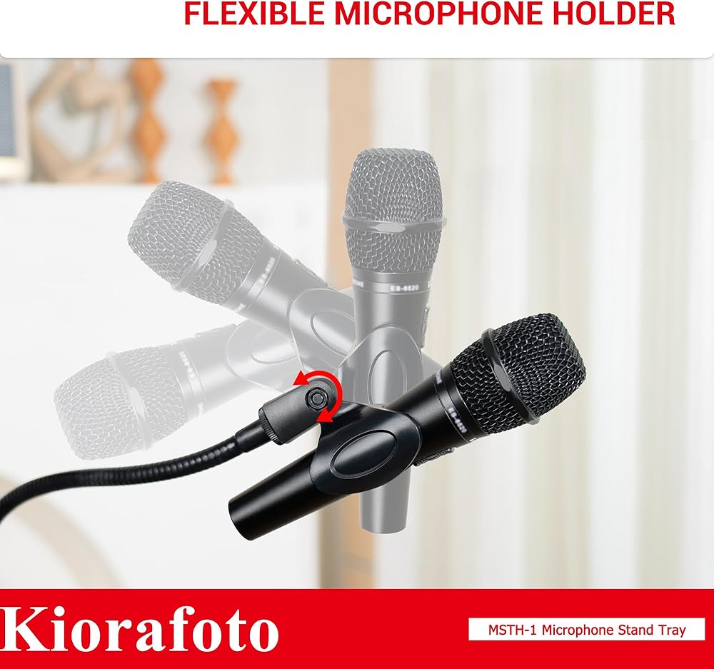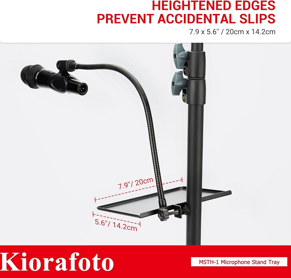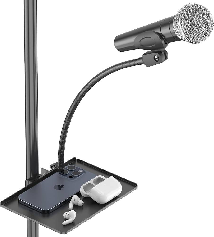 This Microphone Stand Tray is meticulously designed to securely attach to microphone stands or music stands with a diameter ranging from 0.2 to 1.1 inches (5 to 28mm).This ingenious accessory is designed to bring convenience within your reach, allowing you to store items like sound cards, capos, phones, and more effortlessly. Whether performing on stage, working in an office, teaching in a classroom, presenting in a lecture hall, acting in a theater, recording in a studio, participating in a seminar, attending a meeting, or simply at home, this versatile tray proves its worth. With a remarkable maximum load capacity of 6.6 pounds (3kg), this tray offers robust support for your essentials. Its straightforward yet practical design makes installation a breeze. Mount it to your microphone stand, adjust it to the desired height, and then secure it by tightening the screws. Adding to its versatility, the tray features a microphone holder with a flexible arm that bends easily, allowing you to customize its position to your preference. This tray is constructed from high-quality metal material, exemplifying durability and resilience. Its construction is designed to withstand the test of time, minimizing the risk of fractures or damages. The tray's intelligent design incorporates heightened edges on all sides, offering a protective barrier that prevents items from slipping or rolling off unintentionally. Incorporating convenience and dependability, the Microphone Stand Tray is a testament to innovation. Its intuitive design, inclusive features, and resilience make it an invaluable asset for musicians, educators, professionals, and enthusiasts. Effortlessly enhancing accessibility and convenience, this tray elevates your experience and empowers you to focus on your creative pursuits seamlessly.