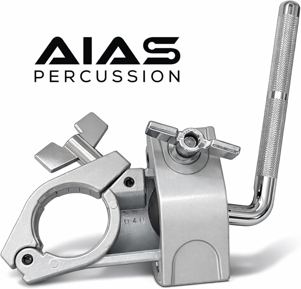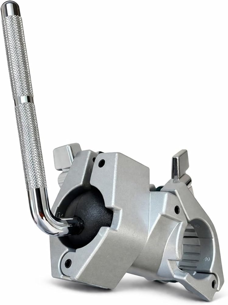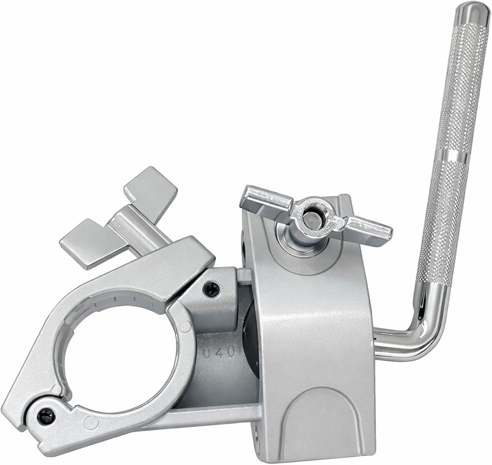 Drum rack mount with 1.5" clamp and rotating L rod (10.5mm) Designed to mount cowbells, tambourines, jam blocks, or 9.5mm toms and e-drum pads Adjustable clamp accommodates various sizes without disassembling the drum rack Rotating ball joint enables precise positioning Can also be used as a mount for electronic drum pads