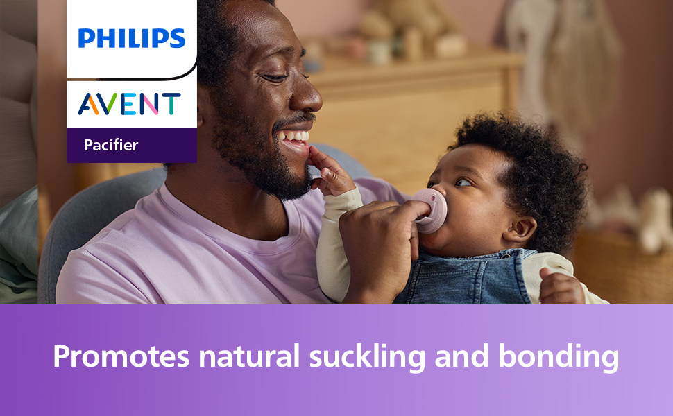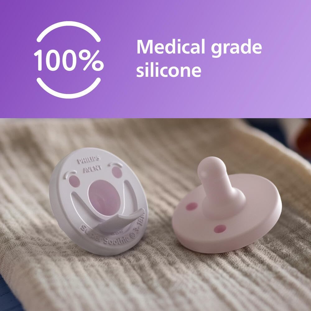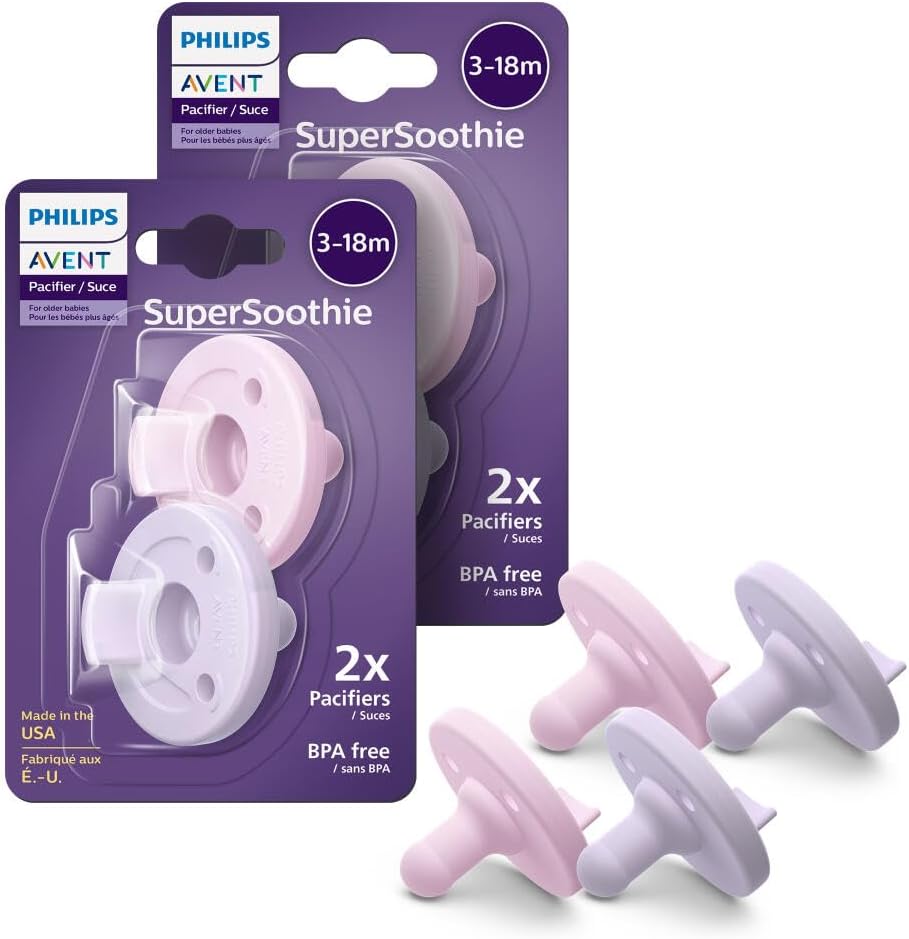 Philips Avent Soothie one-piece pacifiers are specially sized and shaped for babies 3-18 months old and adhere to the American Academy of Pediatrics guidelines¹. The set includes 2 lilac and 2 pink pacifiers.