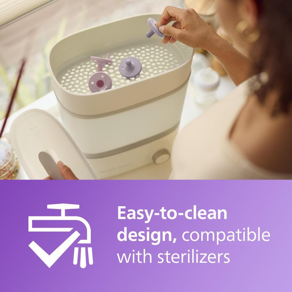 Clean Soothie pacifiers with your sterilizer or submerge them in boiling water. For hygiene reasons, replace soothers after 4 weeks of use.
