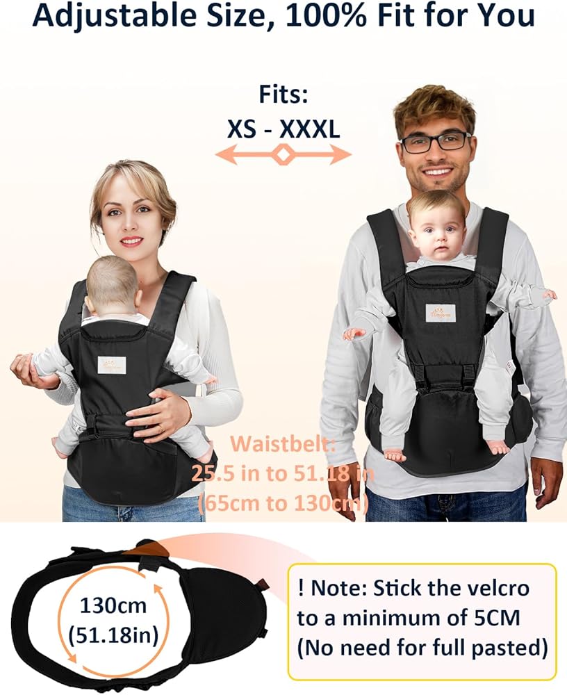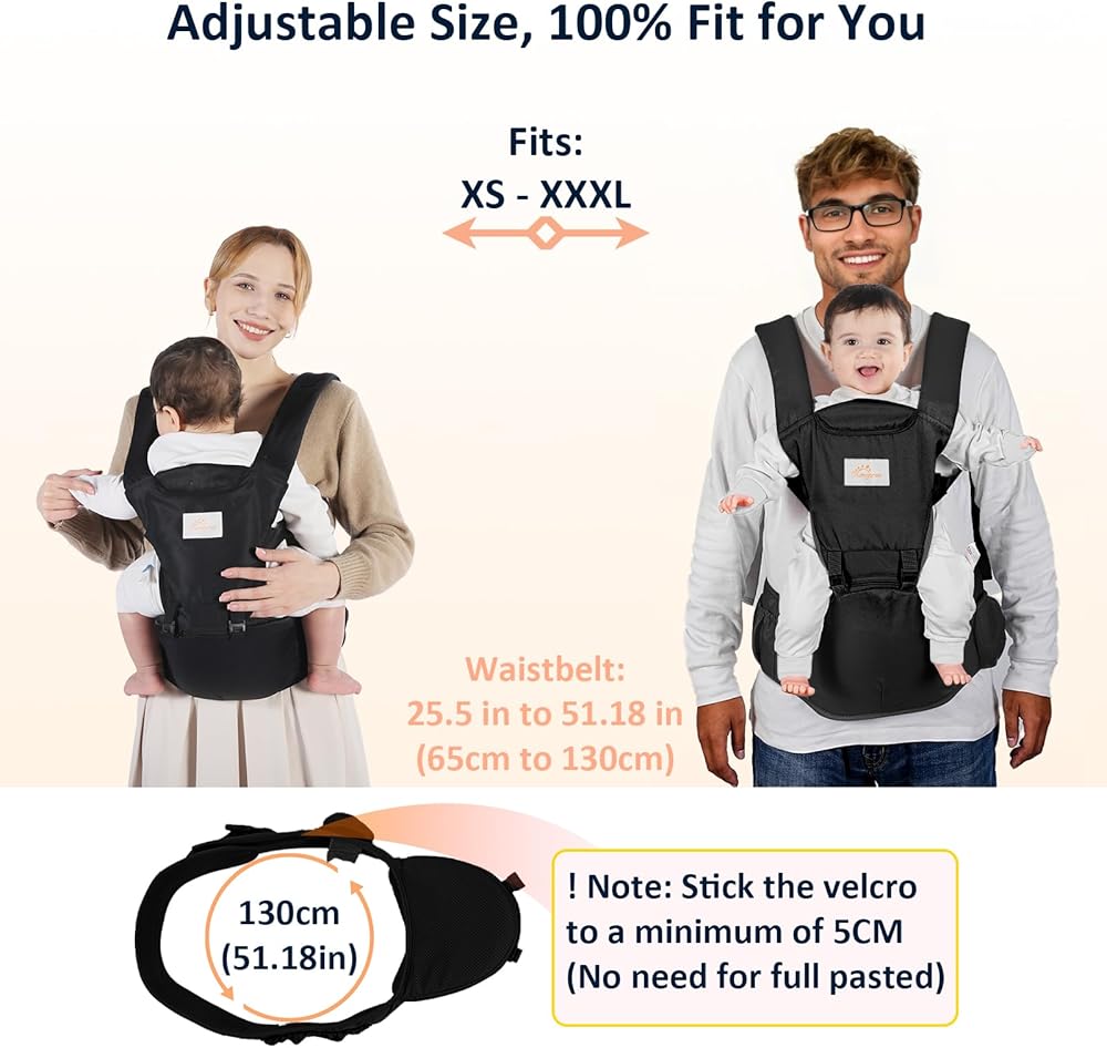 【حامل أطفال قابل للتعديل】أحزمة الكتف وحزام الخصر القابلة للتعديل مصنوعة من بطانة قطنية واسعة (الحزام قابل للتعديل 65-130 سم/25.5-51.18 بوصة)، مناسب لمختلف أنواع الجسم: XS-XXXL