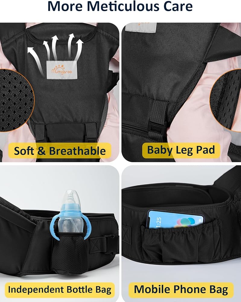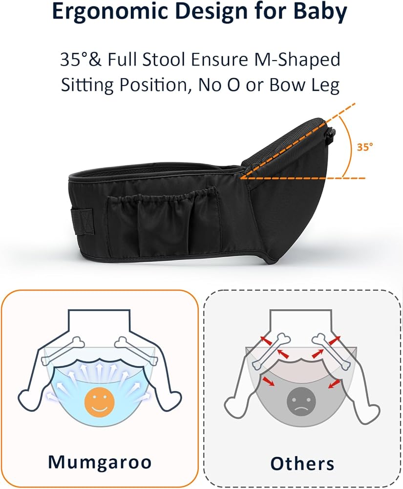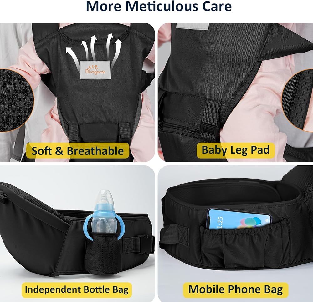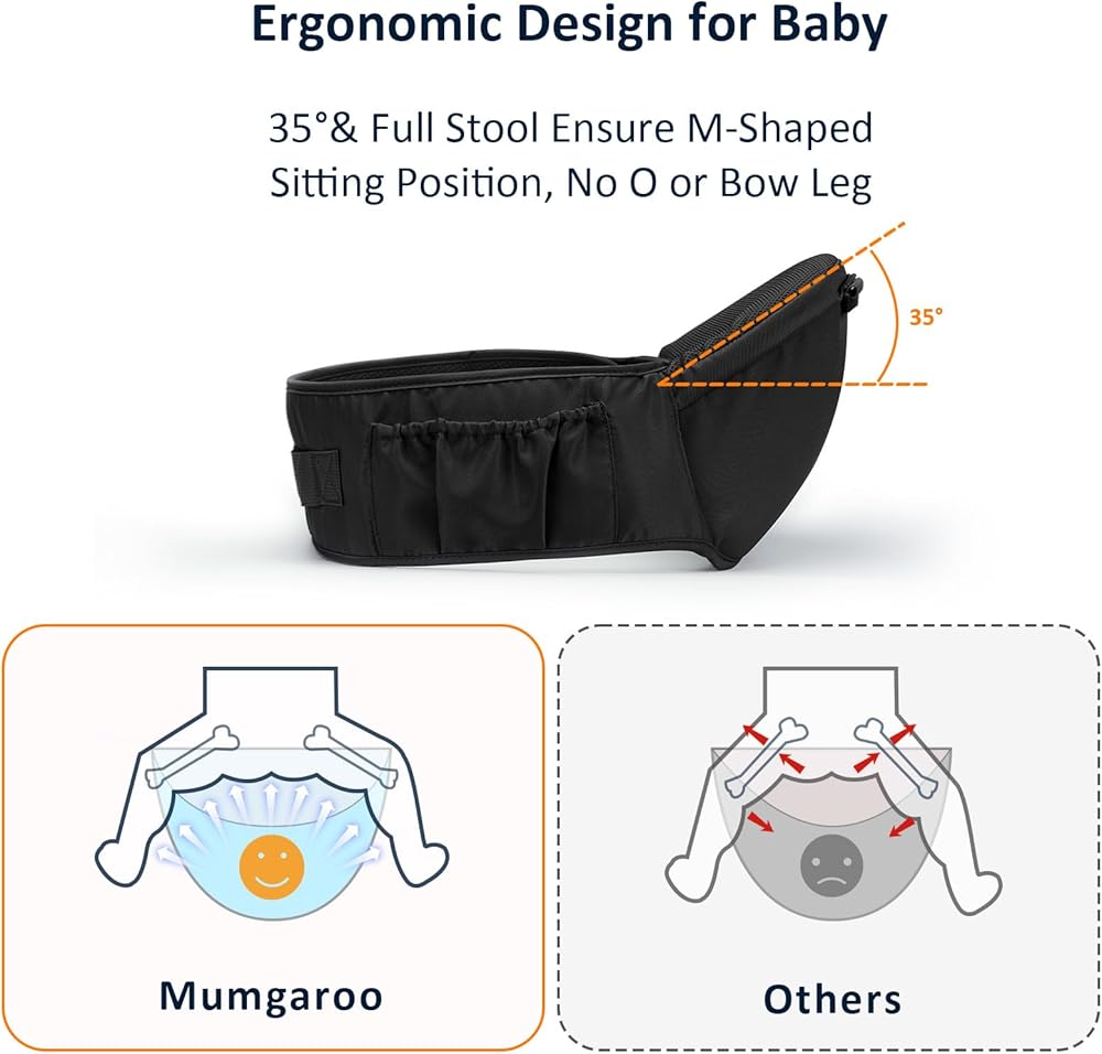 【تصميم الجيب الجانبي】أثناء استخدام حاملة الورك Mumgaroo للطفل، يمكنك وضع هاتفك المحمول والزجاجة والمفاتيح وغيرها من المتعلقات الشخصية في الجيب على جانب حاملة الأطفال حديثي الولادة.