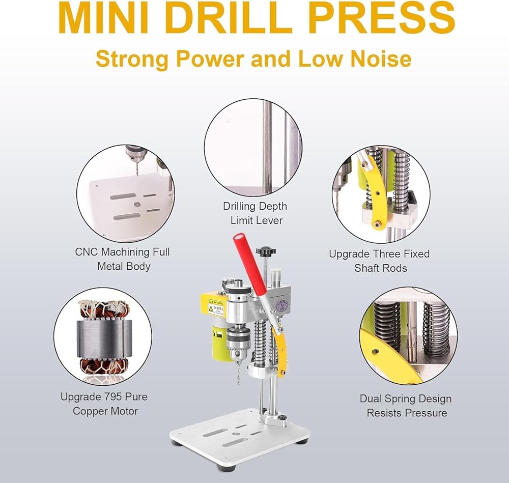 【جودة عالية】المثقاب الصغير مصنوع من الألومنيوم باستخدام الحاسب الآلي. يعتمد المثقاب الصغير على أحدث ترقية لثلاثة أعمدة معدنية، ومحامل وسادة، وكتل ألومنيوم مزدوجة وتصميم زنبركي مزدوج، مع دقة أعلى ومتانة ومتانة.