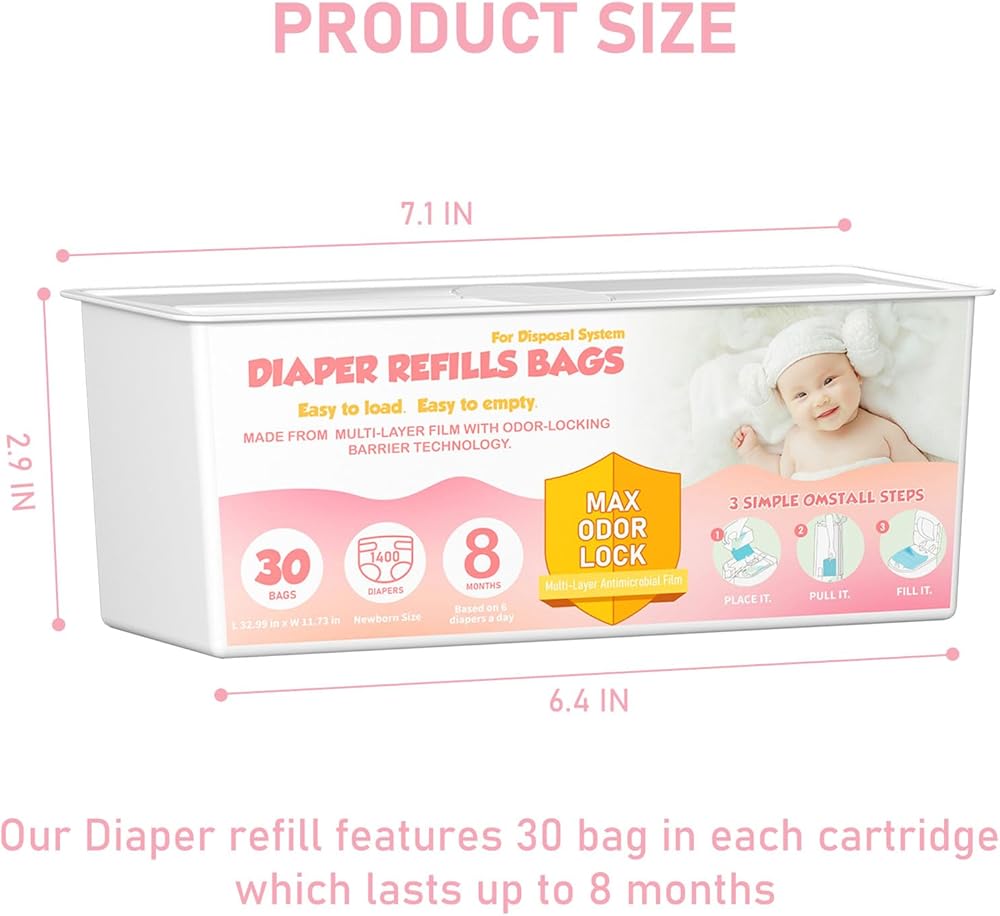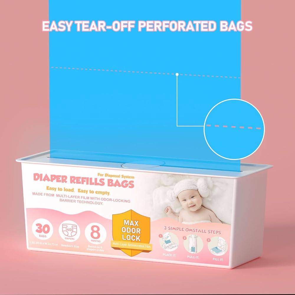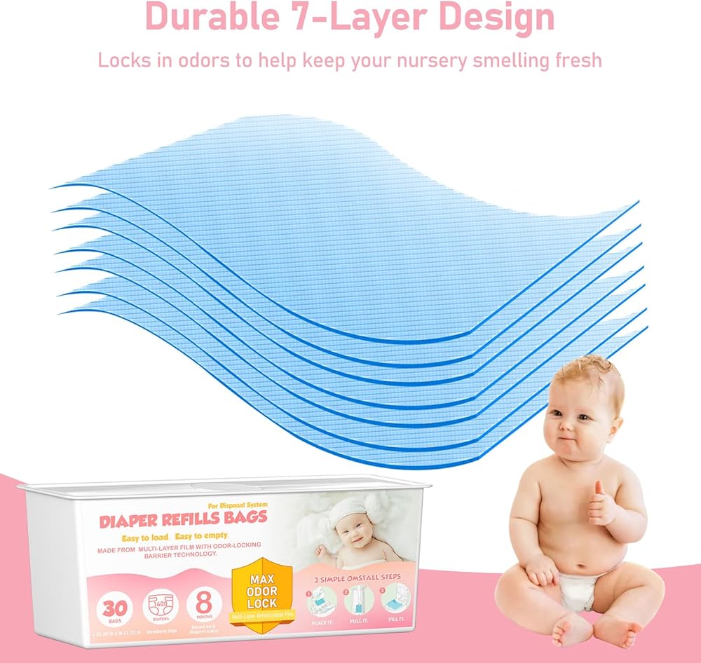 7-Layer Design: Our Diaper Pail Refills Bags are more tear resistant than other available bags, featuring a 7-layer barrier that can easily hold newborn diapers a true help to contain odors, keeping your home fresh and odor-free.