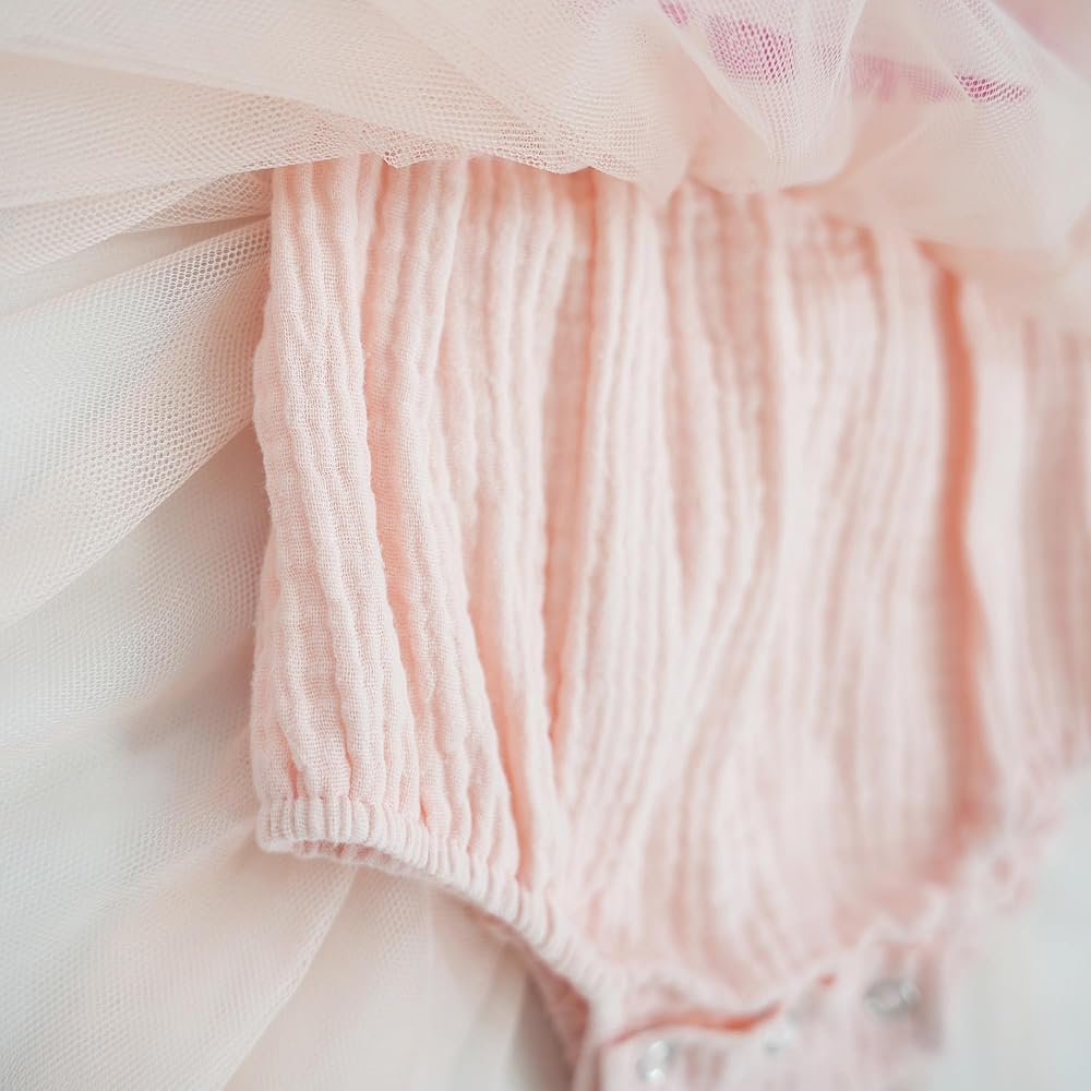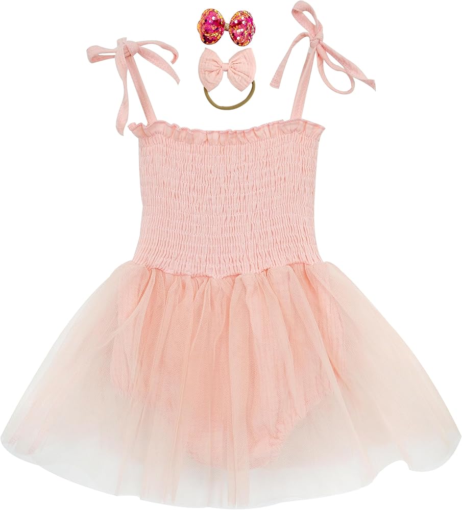 فستان حفلات الأطفال هذا مصنوع من قماش الموسلين والتول، وهو جيد التهوية ومريح. يتميز بأشرطة رفيعة يمكن ربطها على شكل فيونكات رائعة على الكتفين، مع تفصيل حرف "واحد" فخم على الصدر، مما يضفي لمسة أنيقة.