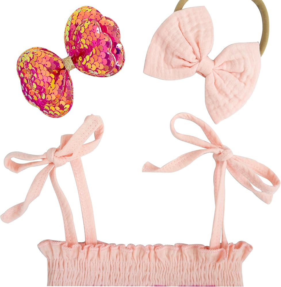 العبوة: فستان أميرة واحد، مشبك شعر على شكل فيونكة لامعة، عصابة رأس واحدة على شكل فيونكة.