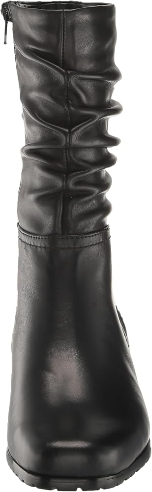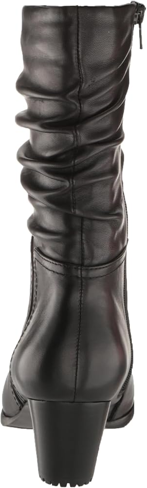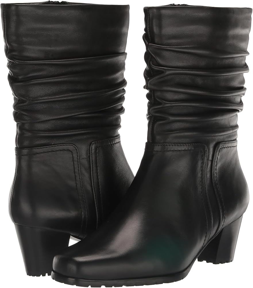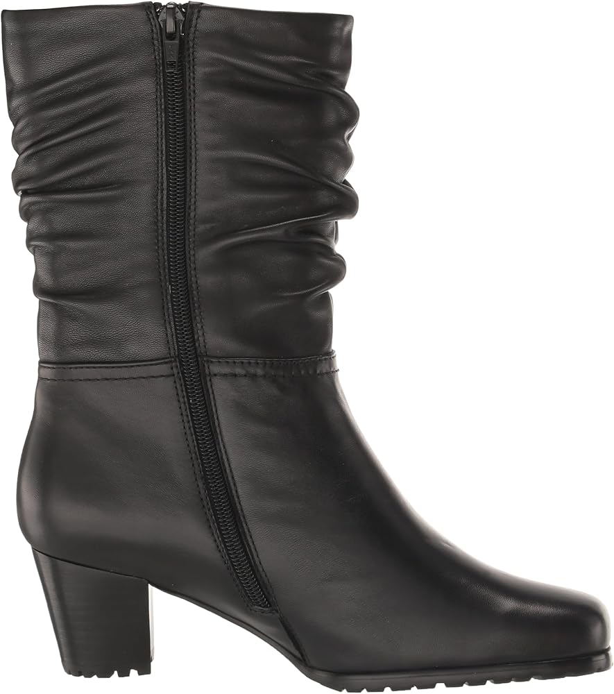 Stylish mid calf boot with very soft pleated lambskin leather upper, interior side zipper for easy on and off, rubber skid resistant outsole, moisture absorbing soft tricot linings