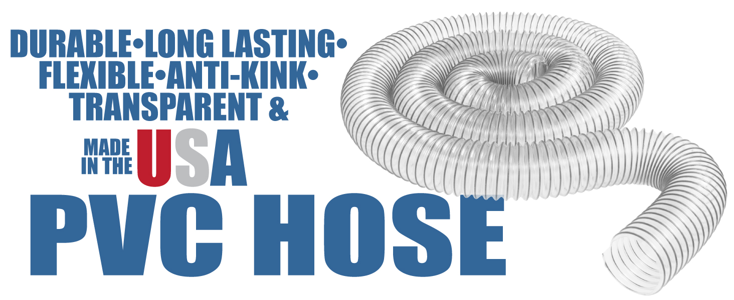 بينما يمكن استخدام خرطوم PVC في آلات أو أجهزة أخرى، فقد تم تصميمه لأغراض جمع الغبار. نطاق درجة حرارة الخرطوم هو -20 درجة فهرنهايت إلى 165 درجة فهرنهايت وهو مثالي للاستخدام الداخلي كما هو الحال في بيئة الأعمال الخشبية أو ورشة العمل. يلتف الخرطوم الشفاف حول حلزون سلكي من الفولاذ الكربوني الأسود الذي يعزز الخرطوم لمنعه من الالتواء ويكون قادرًا على التفريغ الكهروستاتيكي عند تأريضه بشكل صحيح على طرفي الخرطوم.