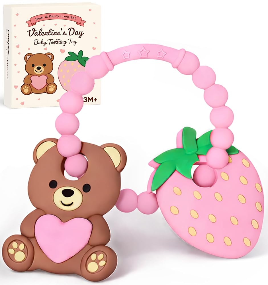 ألعاب حلقة التسنين للأطفال في عيد الحب - عضاضة سيليكون على شكل قلب تيدي بير وفراولة لحديثي الولادة والرضع والأطفال الصغار - سوار مضغ حسي لتخفيف التسنين - هدية مثالية لعيد الحب للأطفال