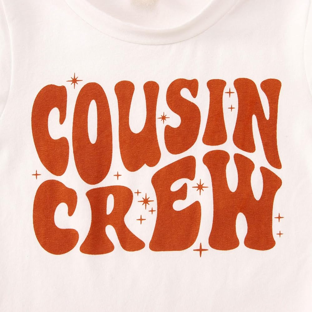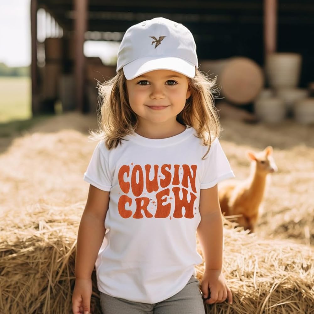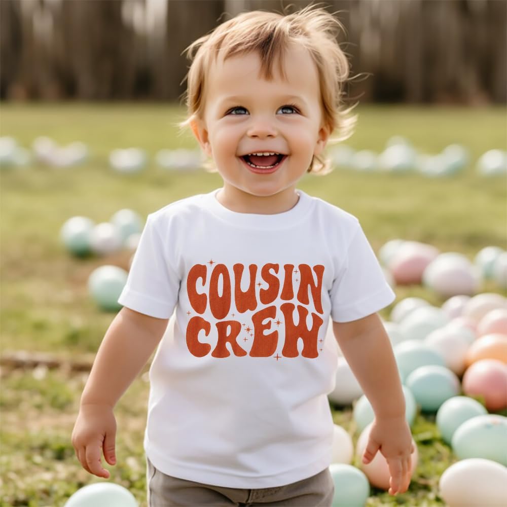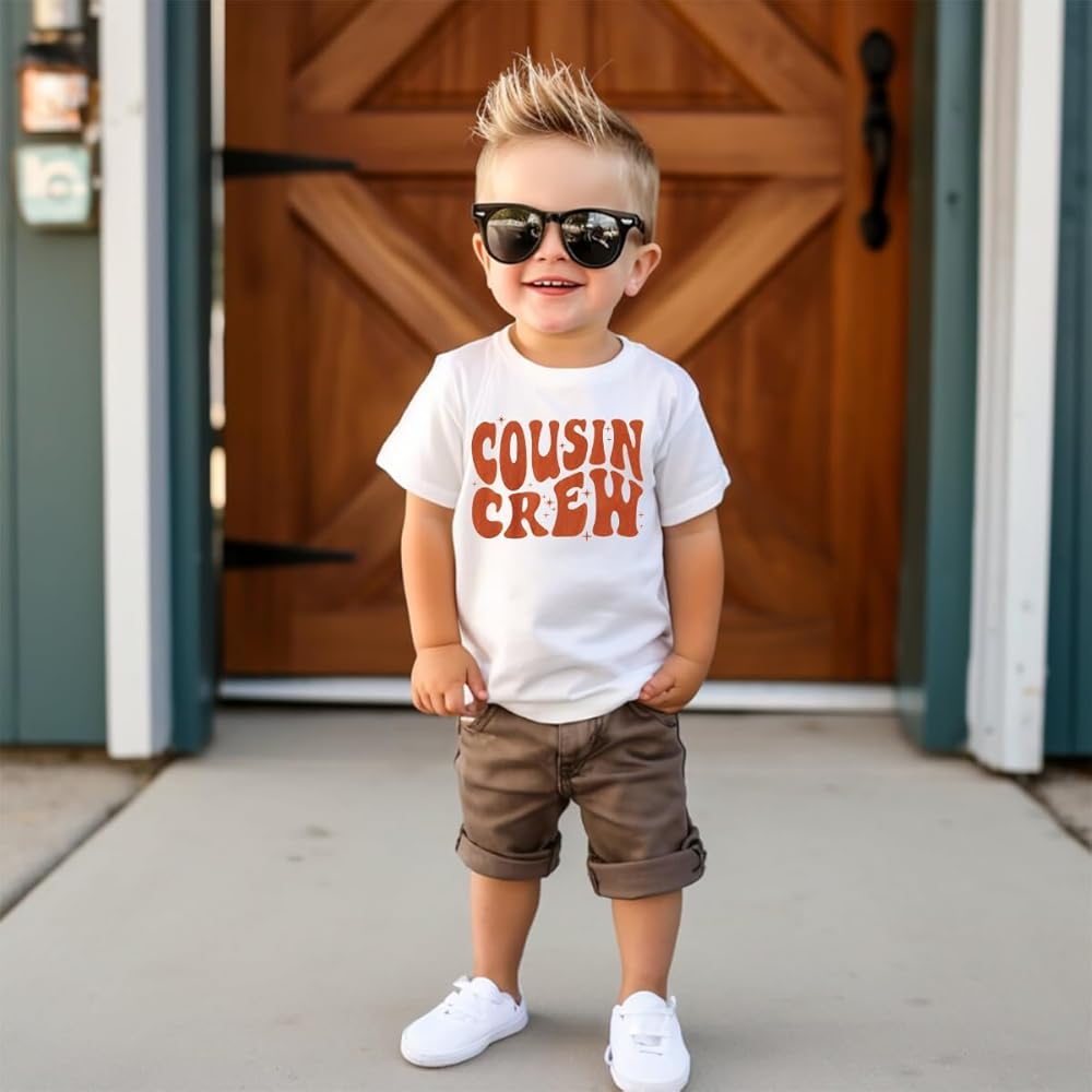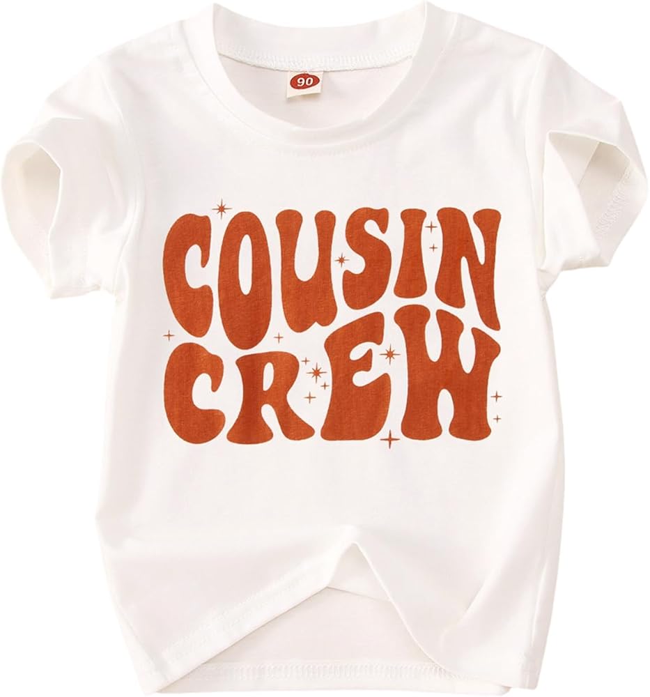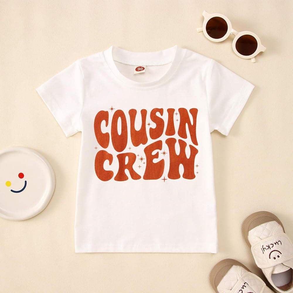 • 【Design】: Baby cousin crew shirt for kids, Toddler boy girl summer t shirts, classic round neck, retro cute cousin crew wavy letter print, toddler boy summer short sleeve t-shirt. Cute letter print t-shirt for toddler girl, baby boy cotton tee shirt, super cozy & stretchy, mom's best choice!