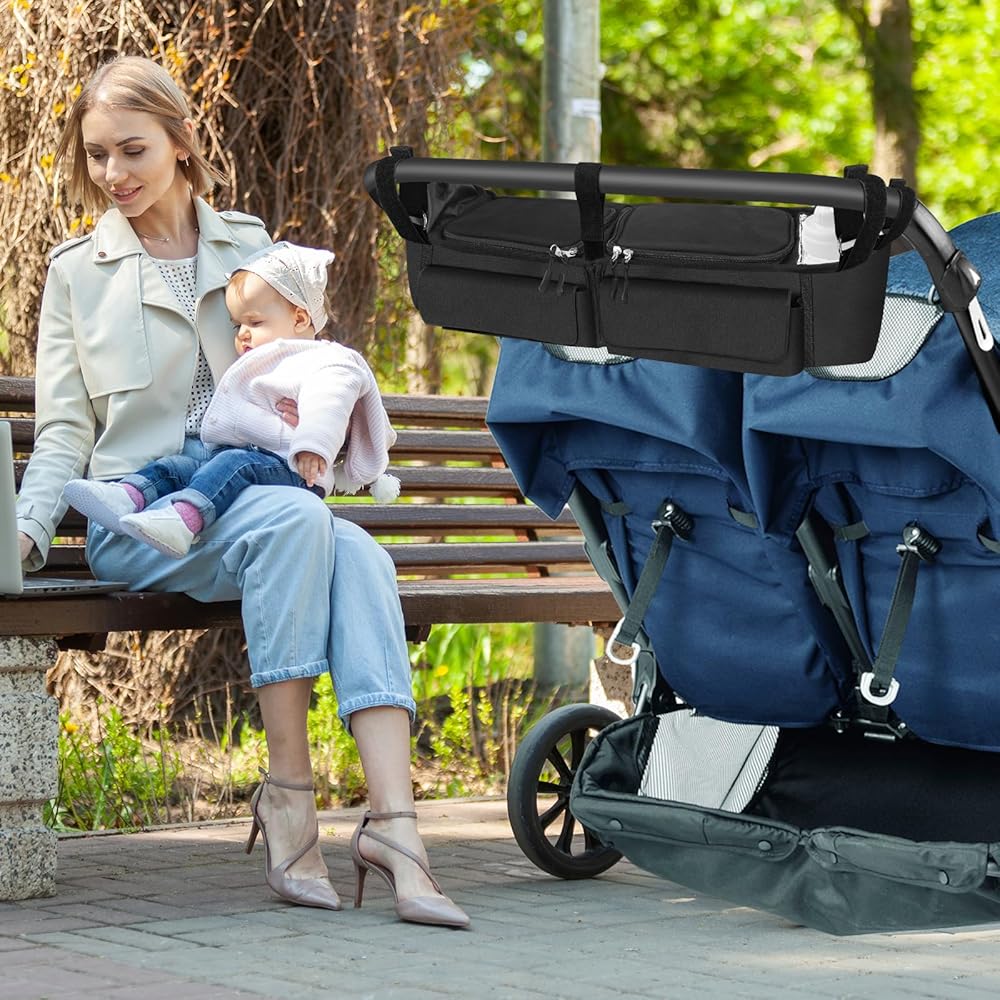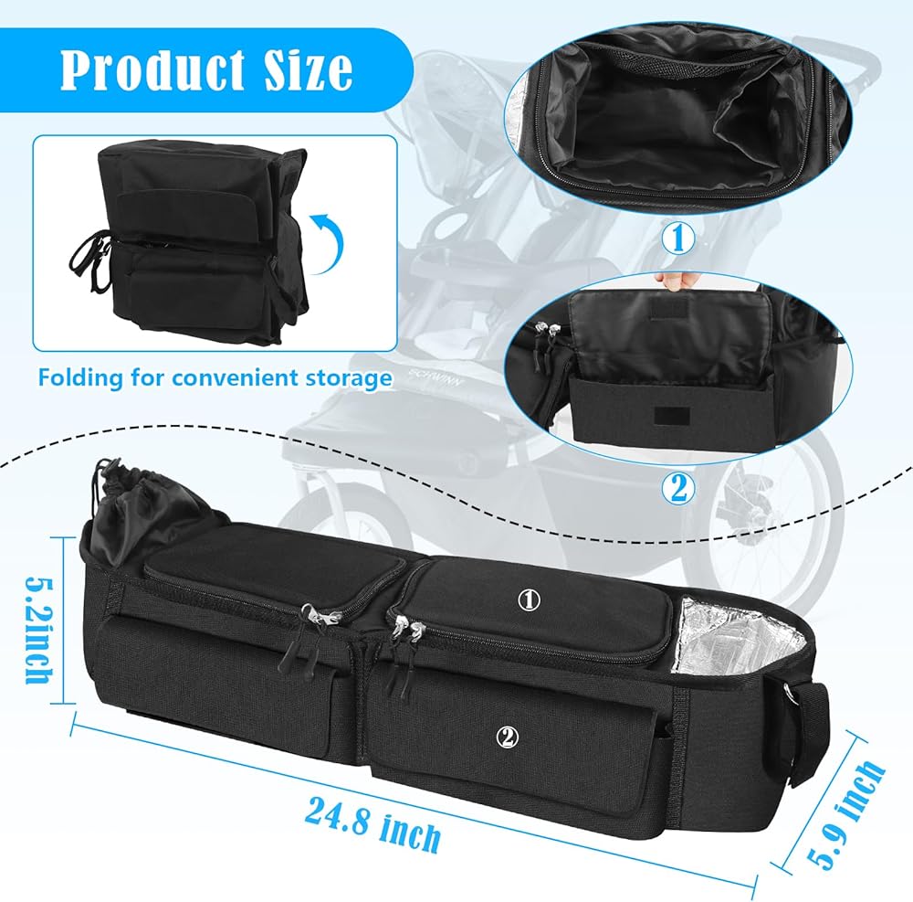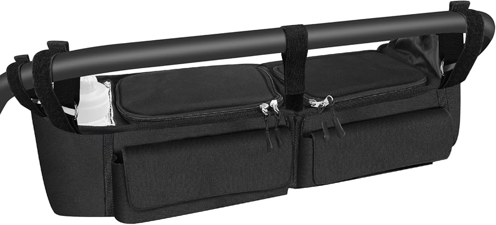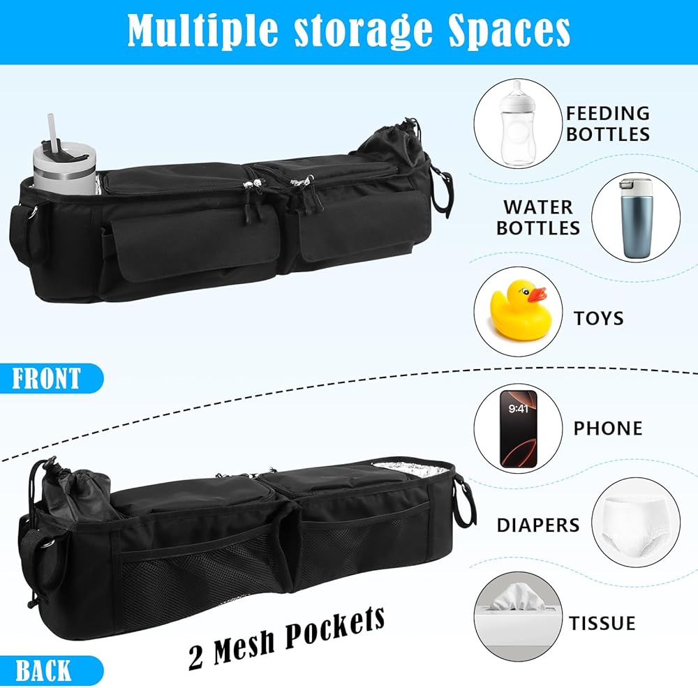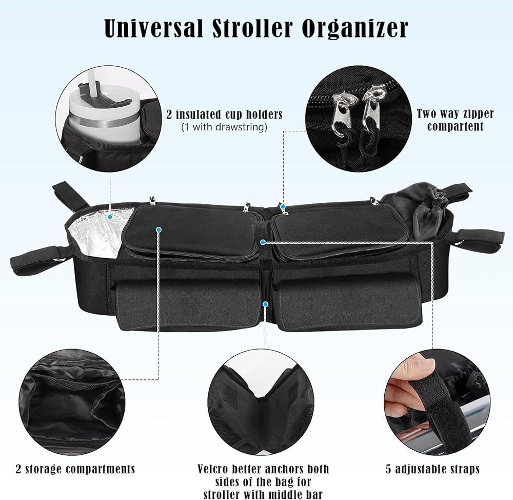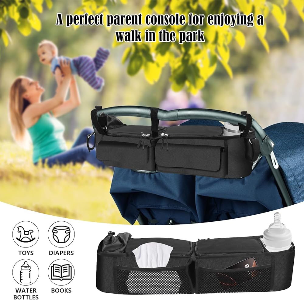 • Easy to install and store: The double stroller organizer is made of high quality nylon with five fixed straps, easy to install, and easily has a perfect parent console for enjoying a walk in the park, and can be folded in half for easy storage when not in use