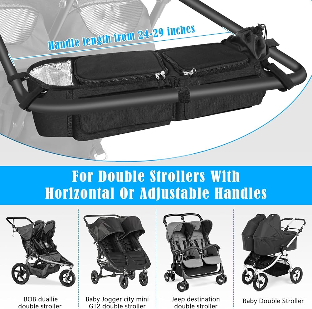 Buying our double stroller organizer means you have a storage bag that is highly compatible with bob BOB Duallie and Baby Jogger City Mini GT2 Double Stroller, the stylish and versatile organizer's interior dimensions are 25INCH
