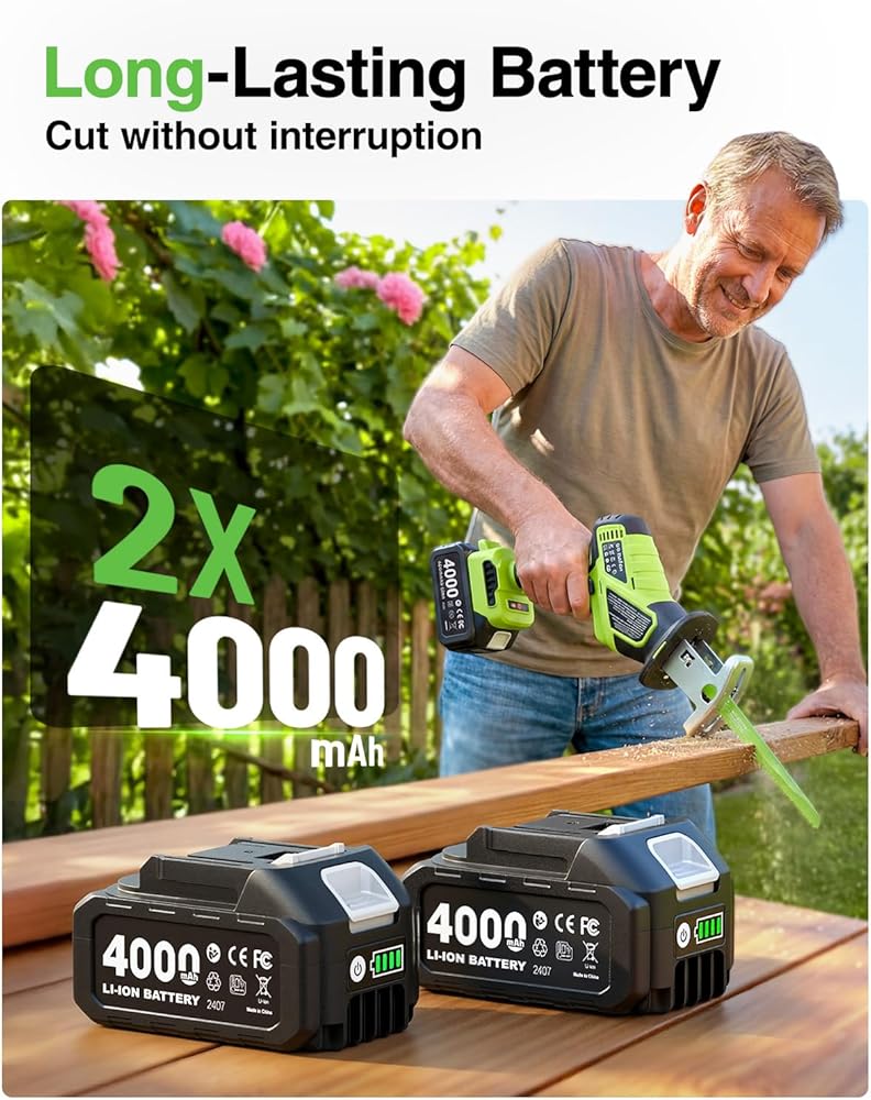 عمر بطارية ممتد مع بطاريات مزدوجة 4.0 أمبير: مزود ببطاريتين 4.0 أمبير، يضمن هذا المنشار الترددي أداءً طويل الأمد. توفر البطارية المشحونة بالكامل ما بين 40 إلى 60 دقيقة من الاستخدام المتواصل، كما أن تصميم البطارية المزدوجة القابلة للتبديل يبقيك على العمل دون إعادة شحن متكررة. مثالية للمشاريع الموسعة التي تتطلب طاقة متواصلة.