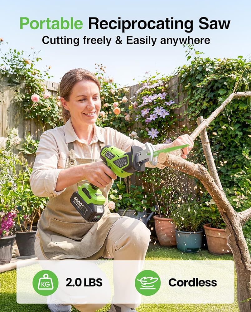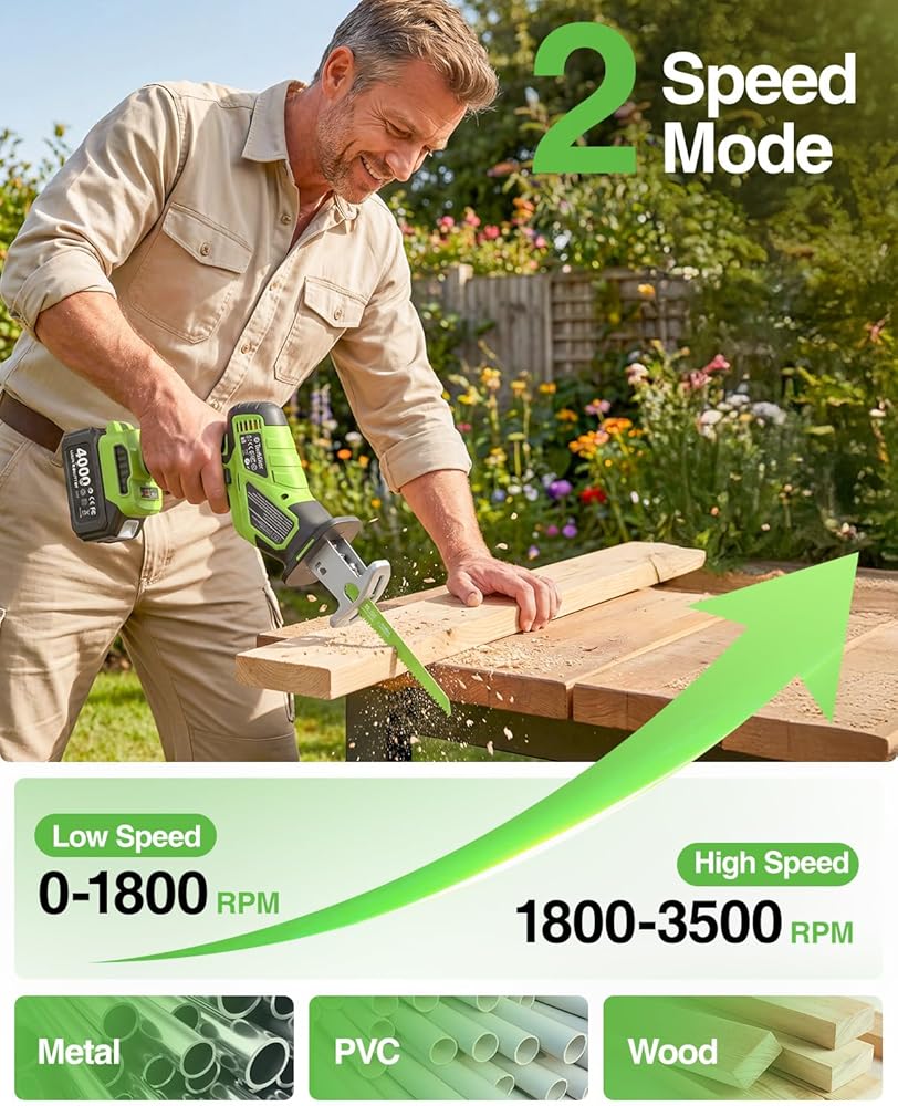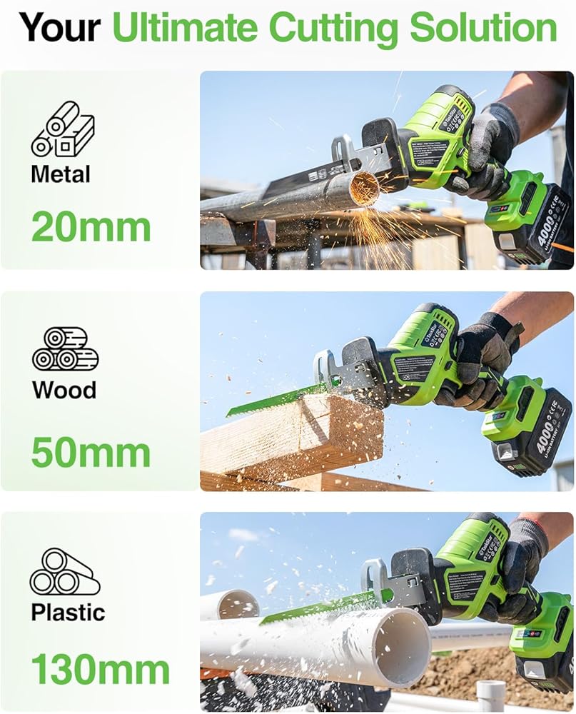 نطاق تطبيق واسع: يعتبر هذا المنشار الترددي للبطارية مثاليًا لتقليم الأشجار الصغيرة والشجيرات ومهام تحسين المنزل المختلفة مثل قطع الخشب والمعادن وأنابيب PVC. سواء كنت في العمل في الفناء أو مهام البناء الصغيرة، فهي الأداة المثالية لأي شخص يعمل في مجال الأعمال اليدوية.