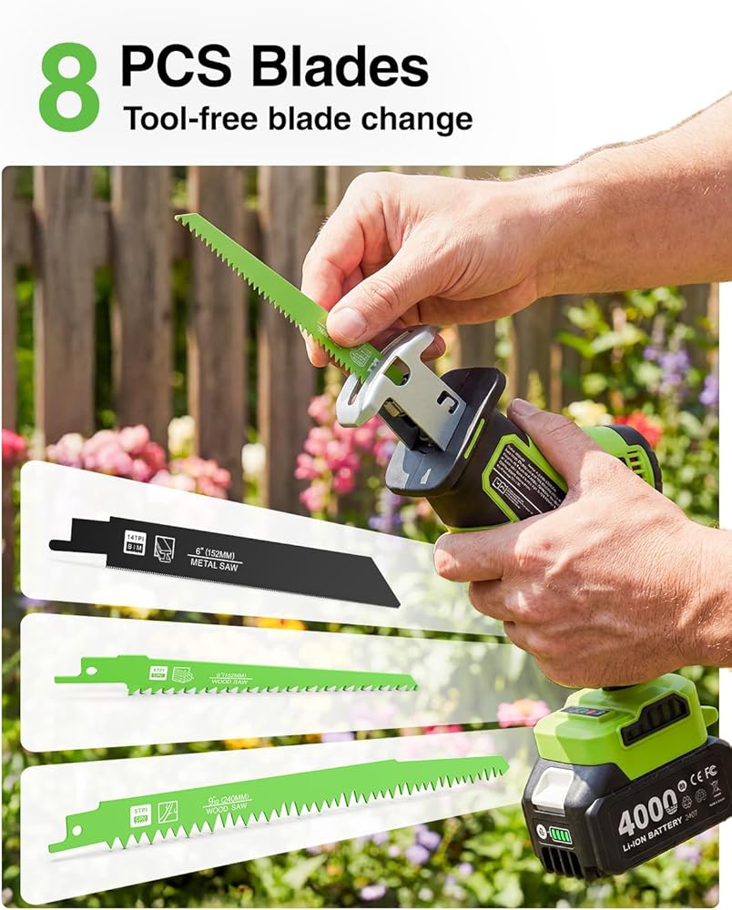 المنشار الترددي اللاسلكي 21 فولت: المنشار الترددي بيد واحدة مع محرك بدون فرشاة 0-3500 دورة في الدقيقة، بطاريات 2 × 4.0 أمبير، 8 شفرات سريعة التغيير، ضوء LED، مثالي لقطع المعادن الخشبية والبلاستيكية