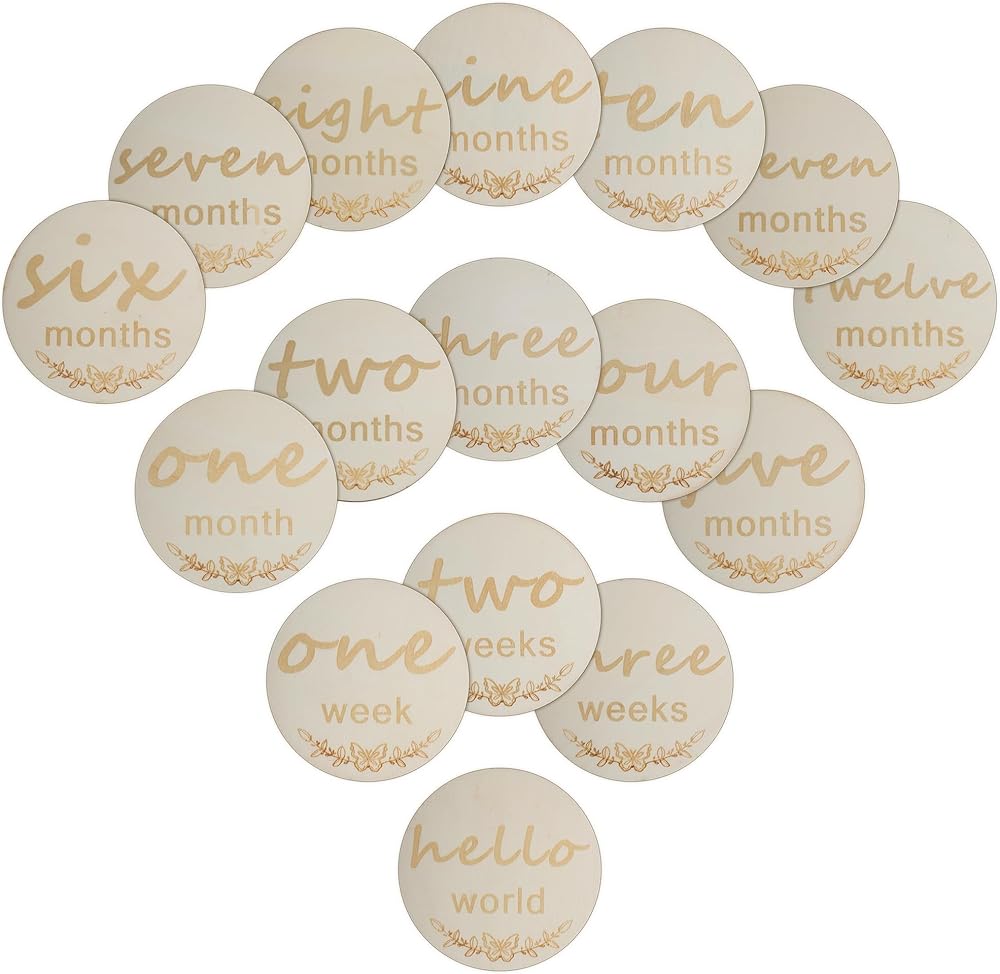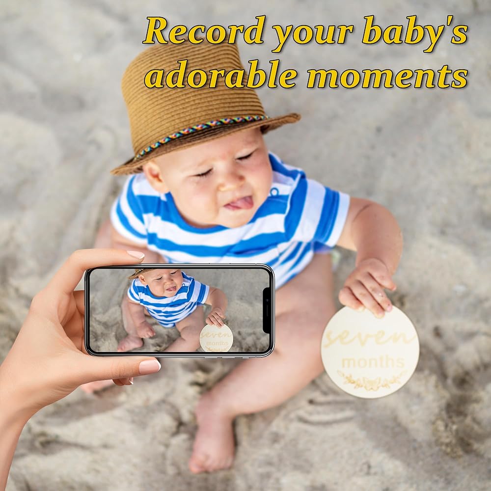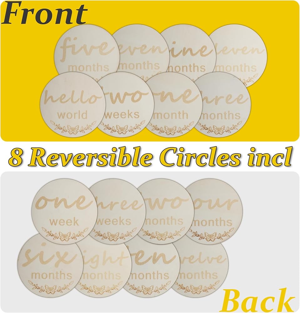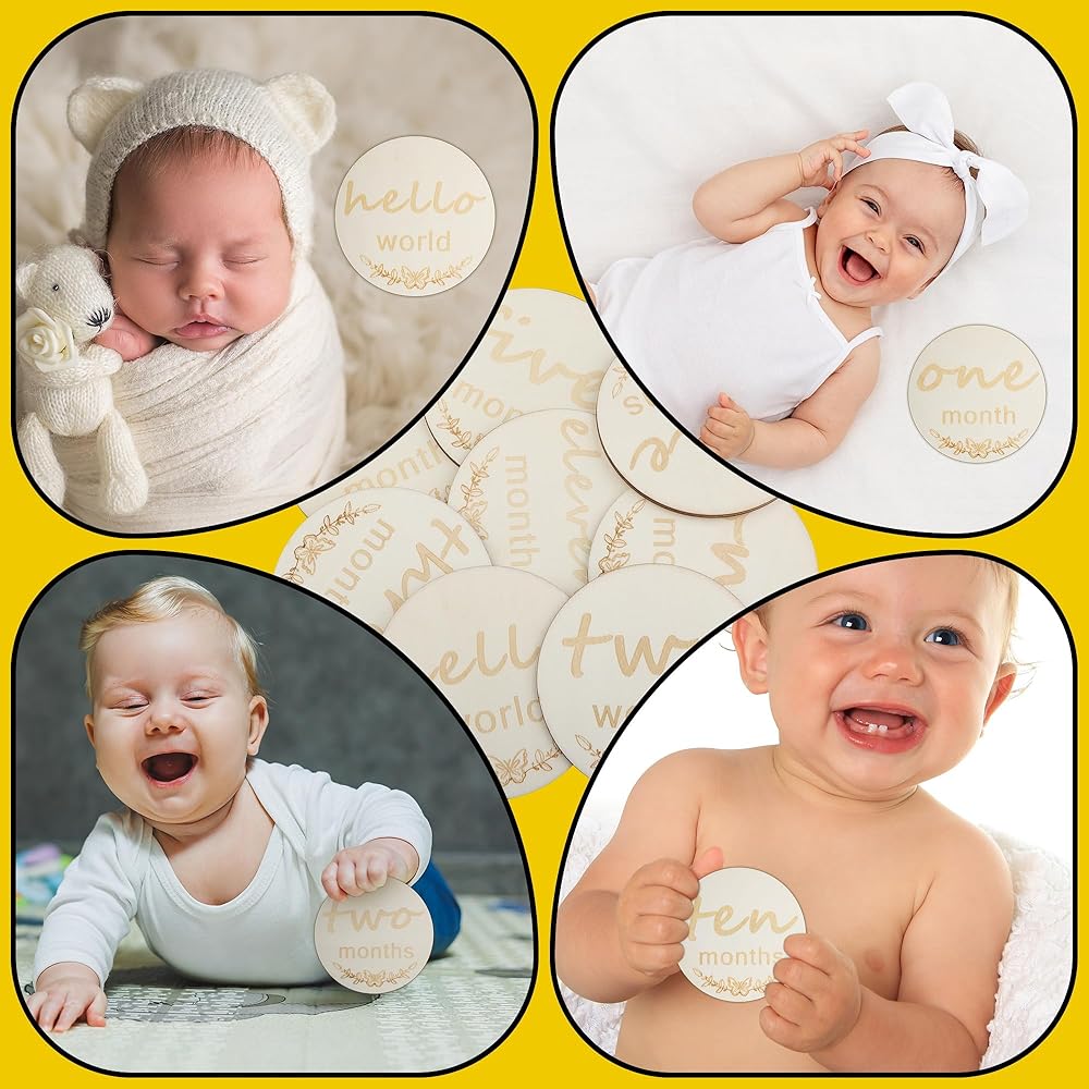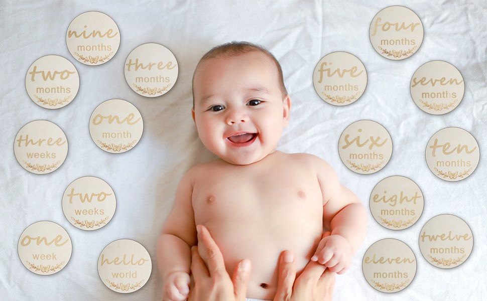 عناصر تسجيل الأطفال: الأقراص الخشبية المميزة شهريًا لطيفة جدًا وصغيرة وقوية بحيث يسهل أخذها إلى أي مكان والتقاط صورك المميزة الشهرية في أي مكان. إنها ضربة كبيرة في حفلات استقبال الأطفال وحفلات أعياد الميلاد.