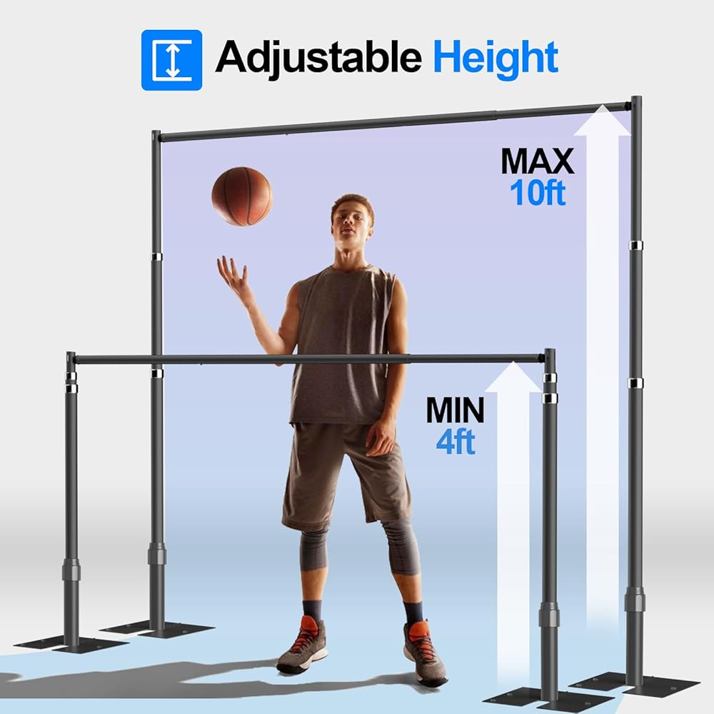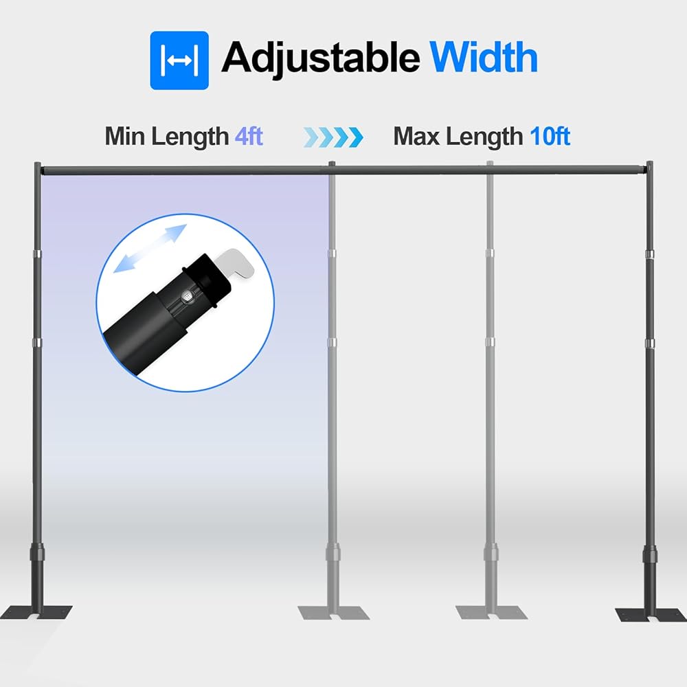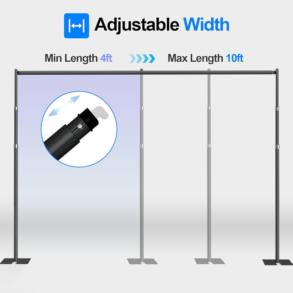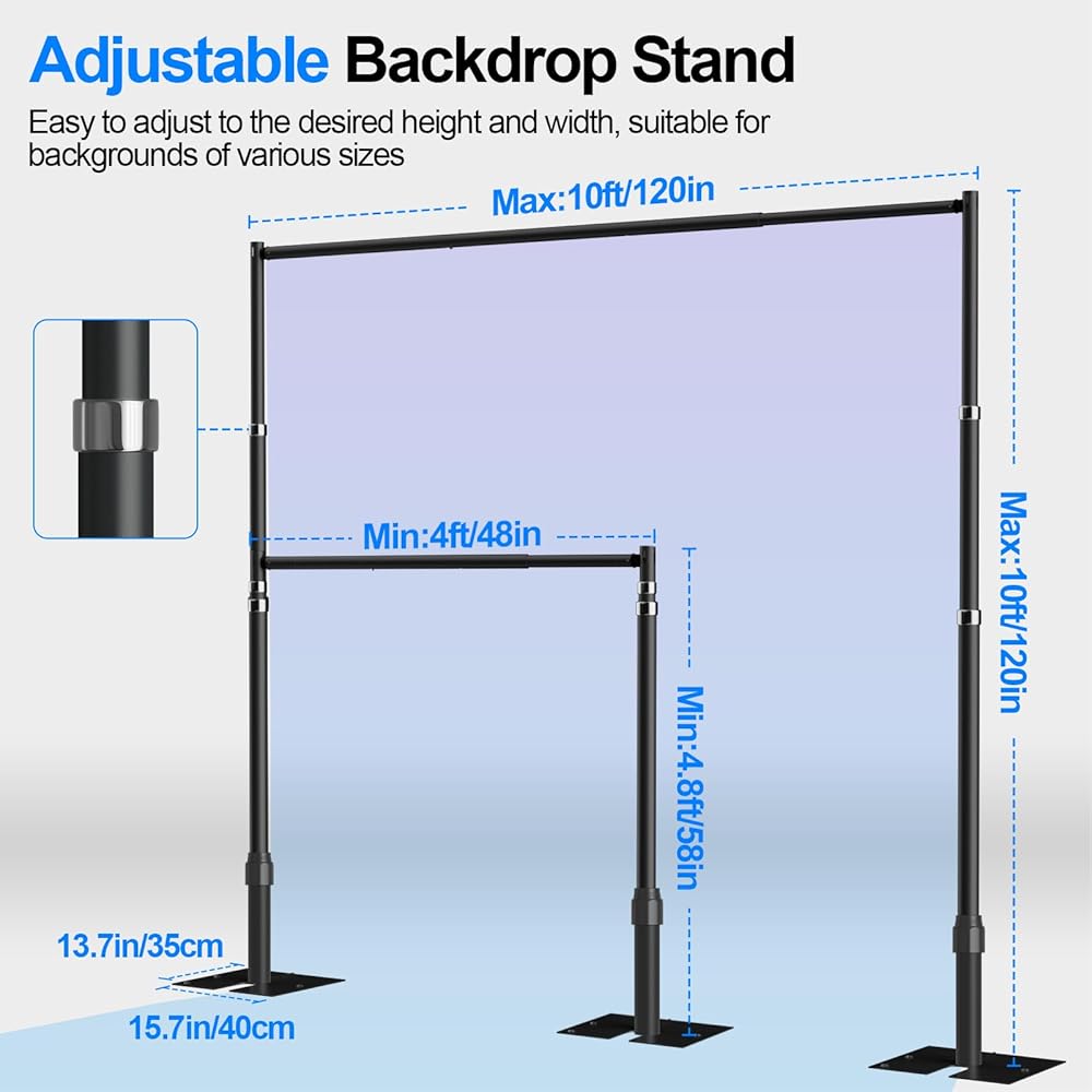 • 【 حامل خلفية قابل للتعديل 】 حامل الخلفية عالي التحمل قابل للتوسيع من 4 أقدام إلى 10 أقدام في الارتفاع. تتصل المدرجات بعارضة تلسكوبية يمكن إعدادها بين 5 أقدام إلى 10 أقدام، مما يوفر تنوعًا ومرونة هائلين