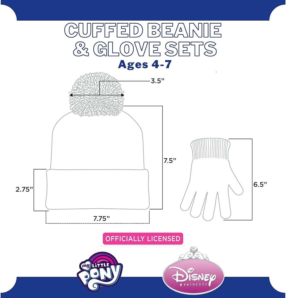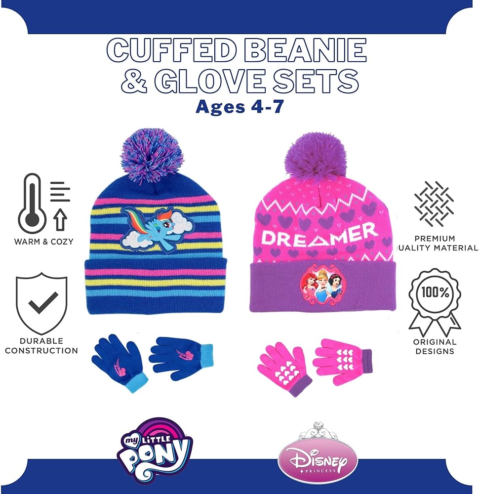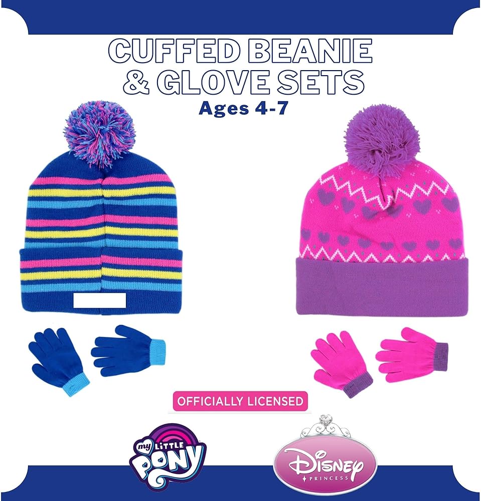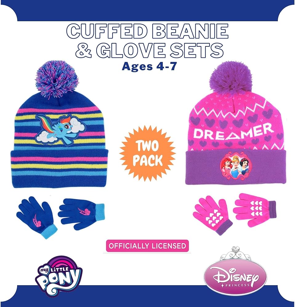FUN AND FASHIONABLE: Featuring colorful My Little Pony and Princess imagery from Hasbro and Disney, this cute and comfy cold-weather baby beanie accessory set is all your little My Little Pony and Princess fan will want to wear all winter. With My Little Pony and Princess at their side to keep their hands warm, they'll be ready for fun and adventure on even the snowiest of days.