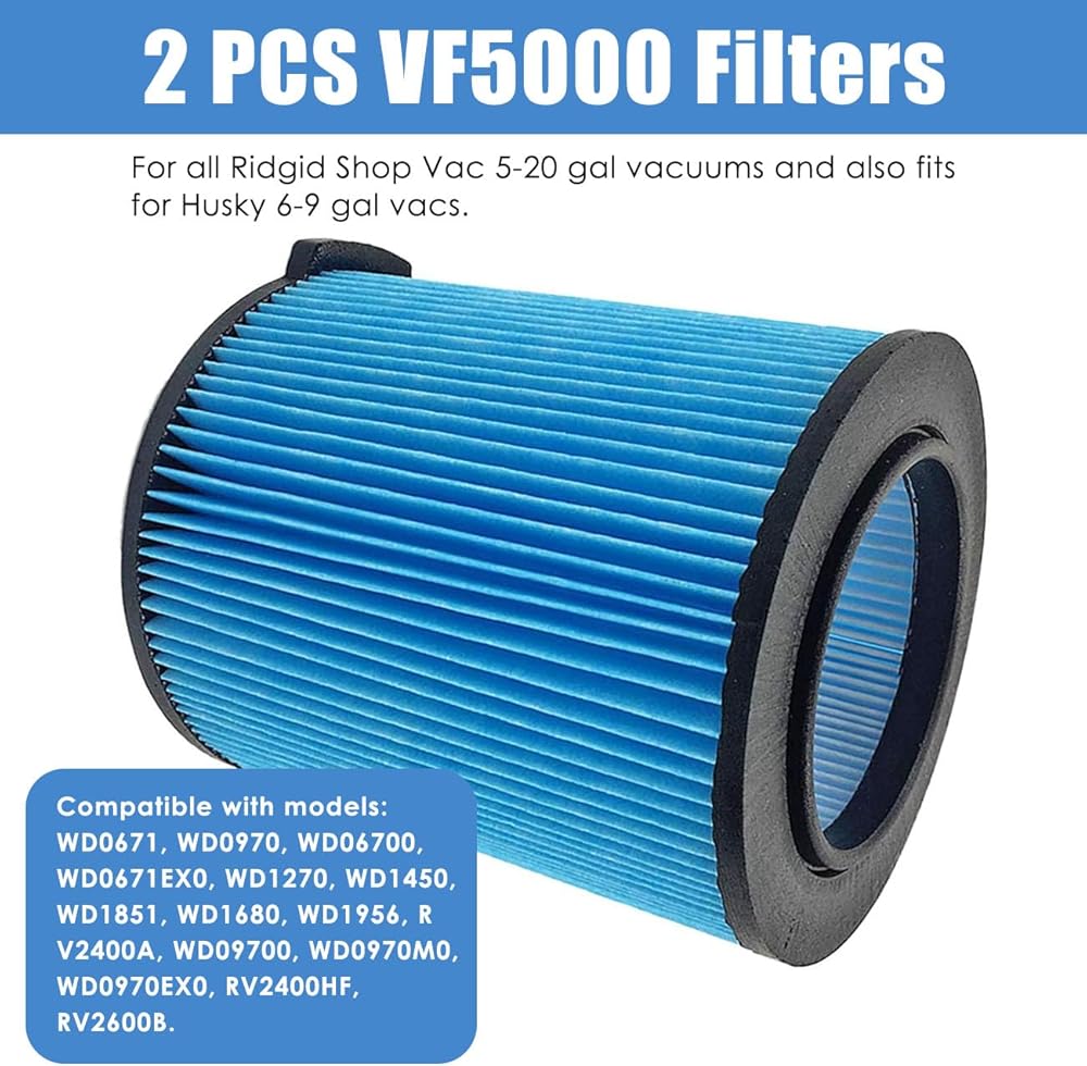 VF5000 Filter Compatible with Ridgid Shop Vac 5-20 Gallon Wet Dry Vacuums (2 Pack VF5000 Filters + 3 Pack VF3502 Bags + 1 Pack Cleaning Brush)