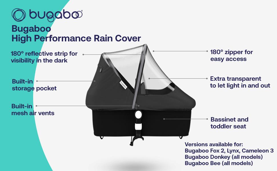 • هذا النموذج خاص بـ Bugaboo Cameleon3. هناك إصدارات مخصصة من غطاء المطر عالي الأداء من Bugaboo لكل عربة أطفال. يمكن استخدامها في كل من وضع السرير والمقعد.