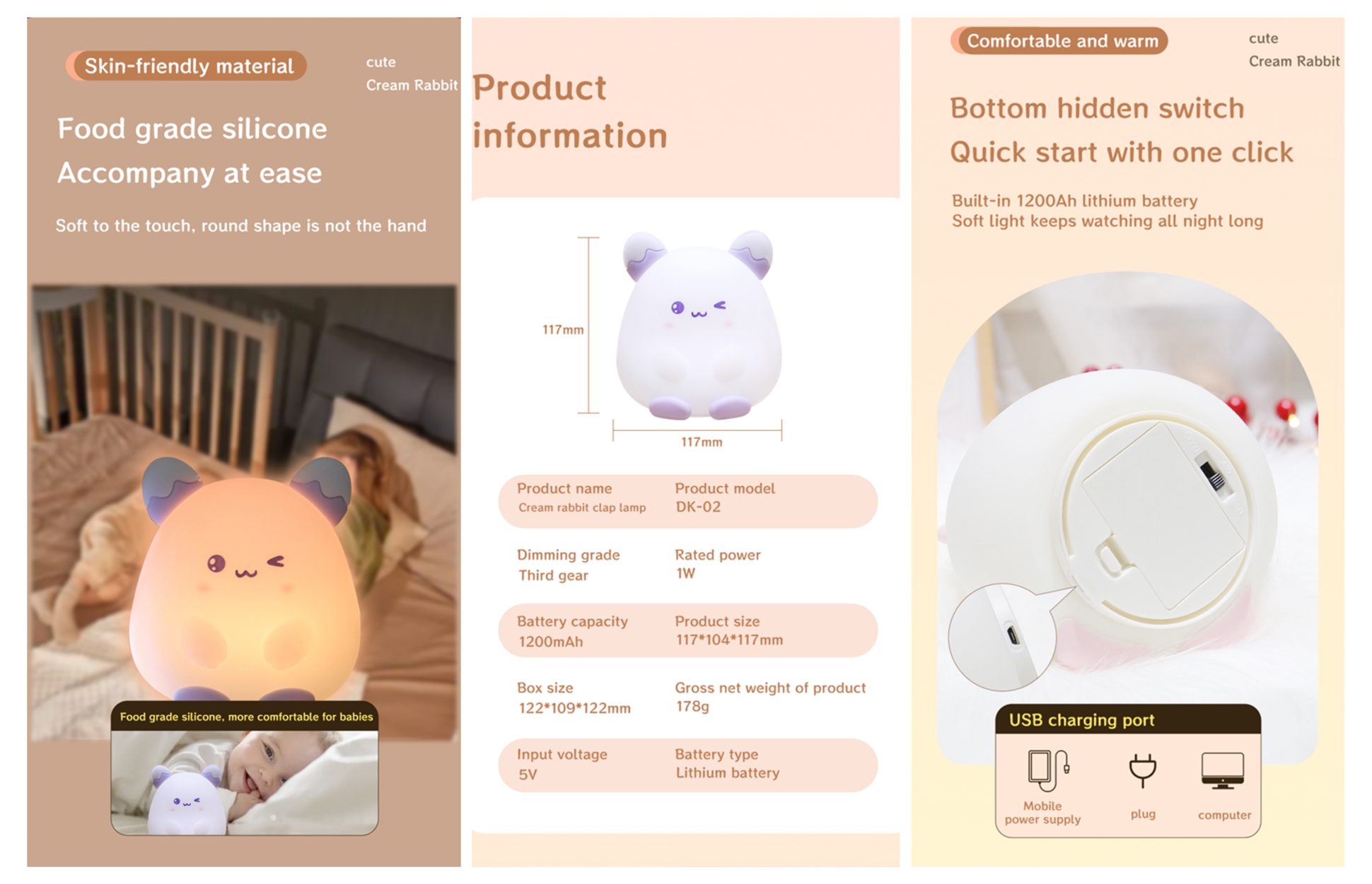 ثلاثة أوضاع إضاءة: يتحول ضوء الأرنب الليلي هذا بين أوضاع الإضاءة البيضاء والدافئة والملونة عن طريق النقر أو الضغط بلطف، والتبديل بسهولة بين الضوء المطلوب. عندما تختار الضوء الملون، إذا كنت تريد لونًا معينًا من الضوء الملون، فما عليك سوى النقر بلطف لتثبيت لون الضوء.