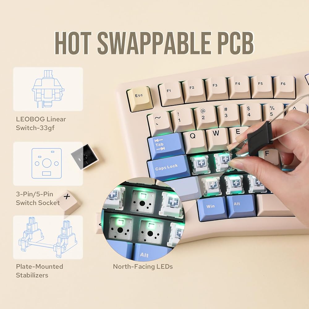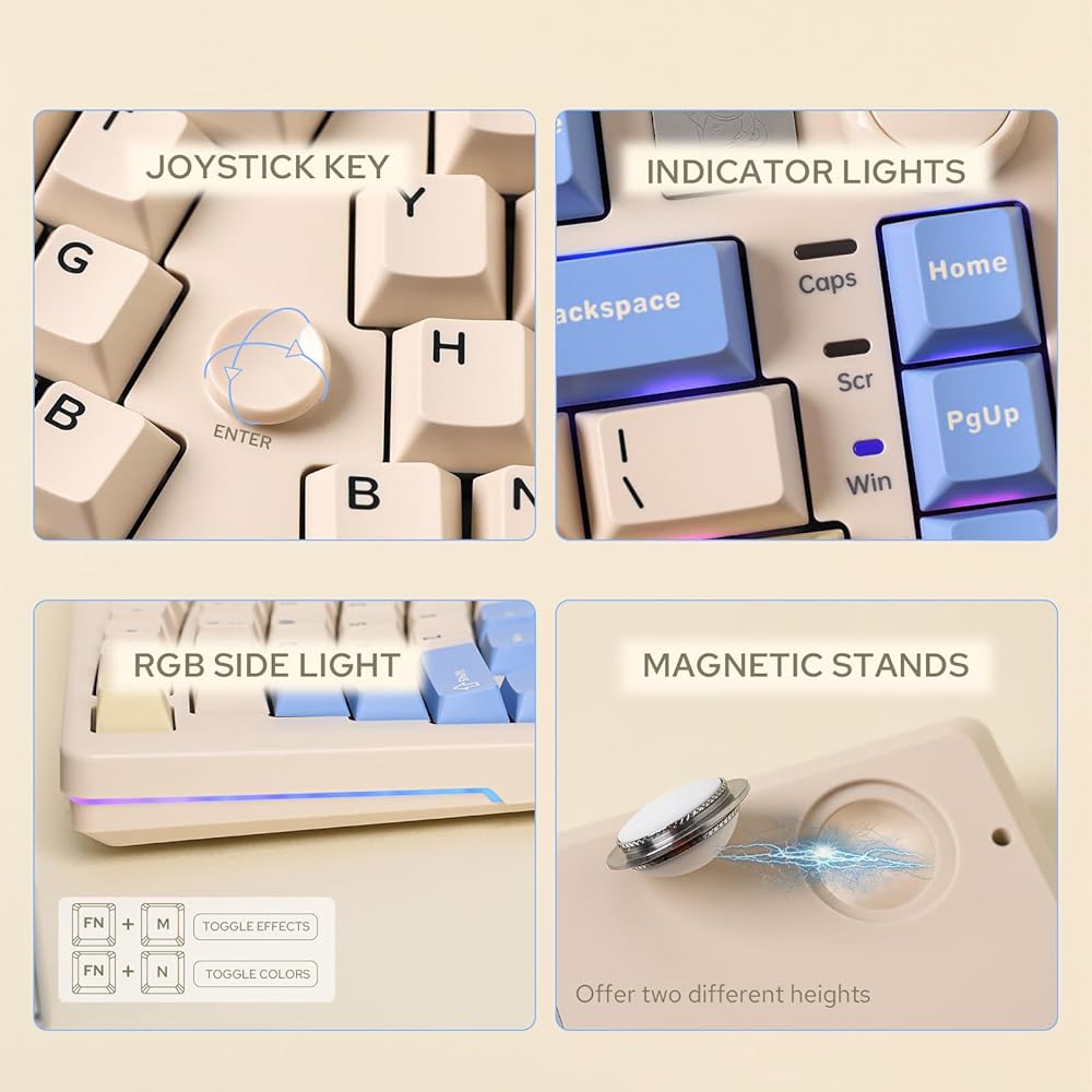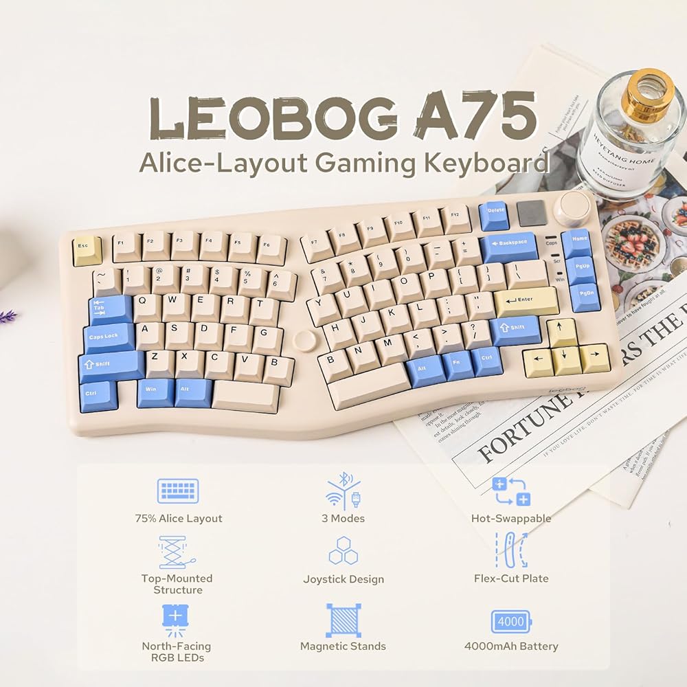 لوحة مفاتيح LEOBOG A75 75% Alice، لوحة مفاتيح ألعاب لاسلكية مع تصميم مقبض وعصا التحكم، لوحة مفاتيح ميكانيكية علوية مع PCB مرن القطع، لوحة كمبيوتر شخصي، حوامل مغناطيسية لنظام Win/Mac (أبيض)