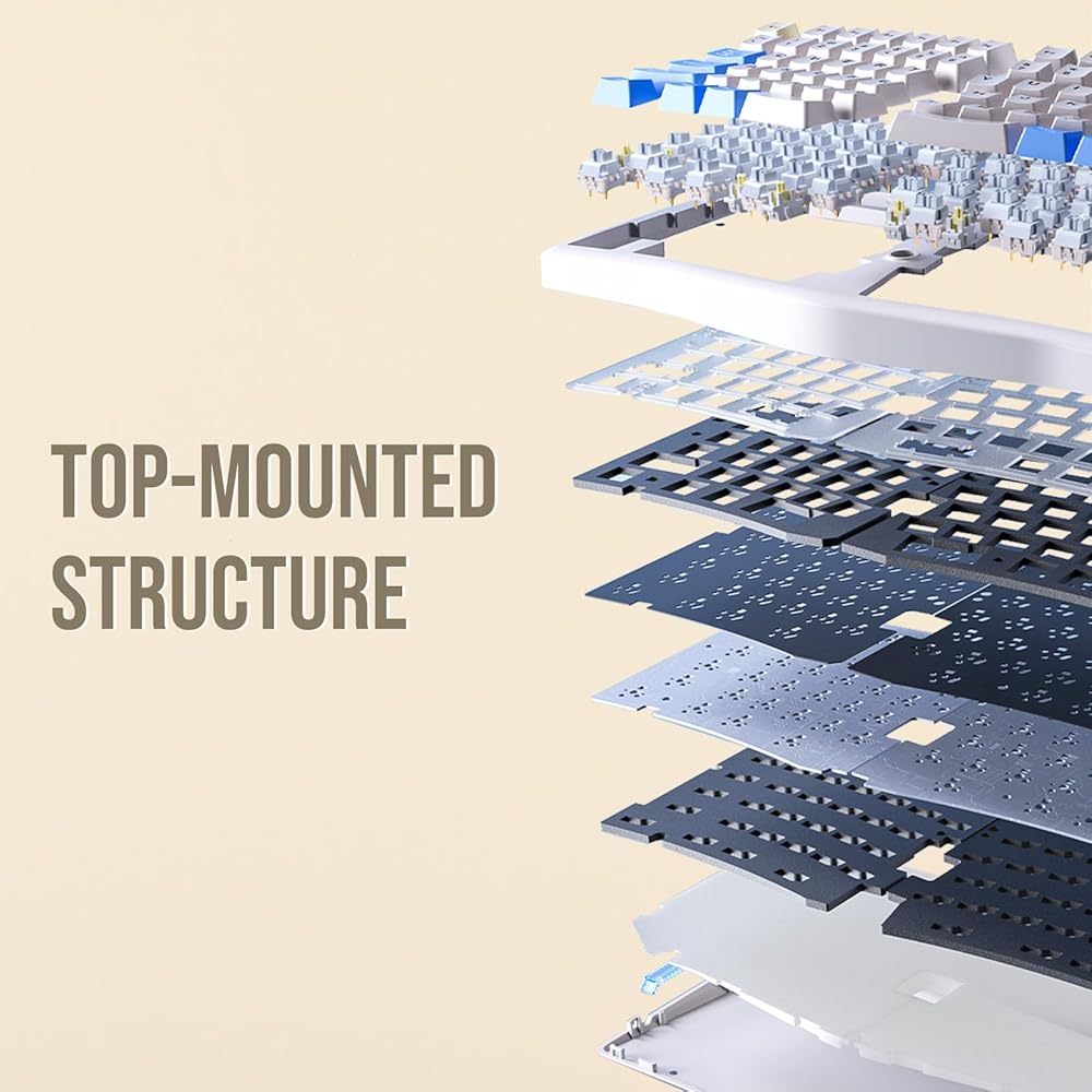 【هيكل التثبيت العلوي مع أربع طبقات من الحشو الداخلي】 يستخدم LEOBOG A75 هيكل تثبيت علوي مملوء بأربع طبقات من المواد المثبطة للصوت: إسفنج PO، ولوحة تبديل PO، ورغوة PO PCB، ووسادة حافظة من السيليكون. تمنع هذه المواد الضوضاء غير المرغوب فيها الناتجة عن الاصطدامات القوية، مما يوفر صوتًا أكثر نقاءً ونقاءً في الكتابة وإحساسًا أكثر متعة في الكتابة، حيث أنها توفر تجربة أقل قسوة مقارنة بلوحات المفاتيح التقليدية التي يتم تركيبها في الأعلى.
