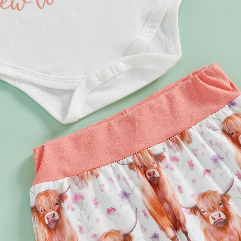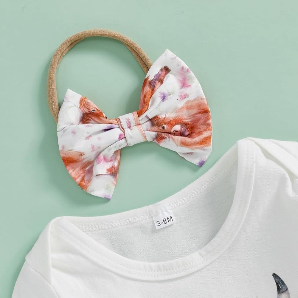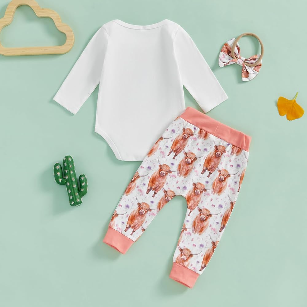 Baby Girl Fall Outfit Highland Cattle Print Long Sleeve Romper with Elastic Waist Pants and Headband 3 Pcs Set