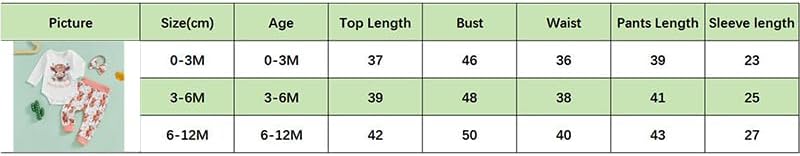 3-6M Tops Length: 15.35 Bust: 18.9 Sleeve: 9.84 Pants Length: 16.14 Waist: 14.96 Advised Age: 3-6 Months