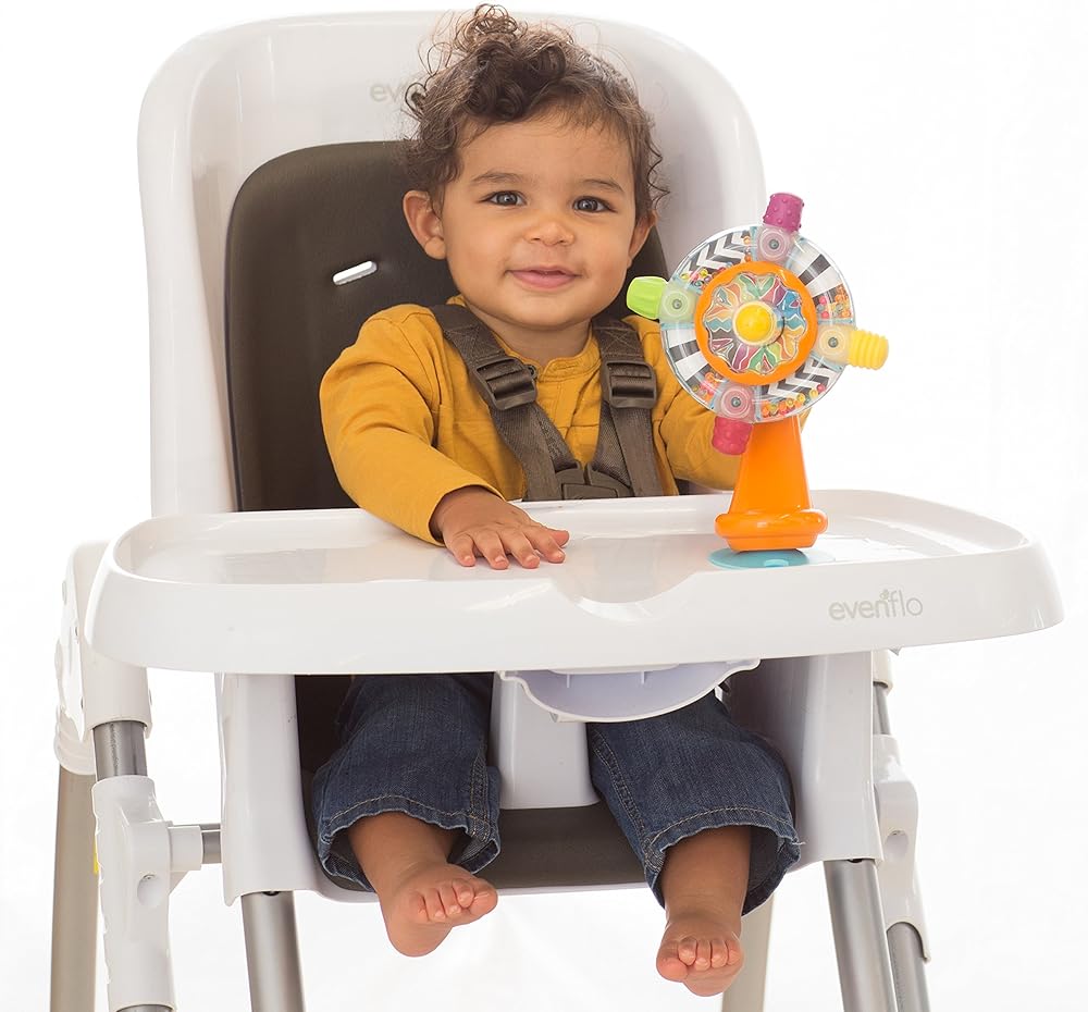 Designed to stimulate all the senses, this engaging toy encourages discovery and play! A large, secure suction cup base attaches toy to clean high chair tray or table top. The visually engaging spinning wheel features high-contrast colors, bouncing rattle beads and kaleidoscope effects.