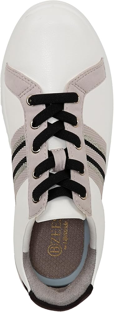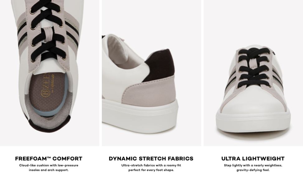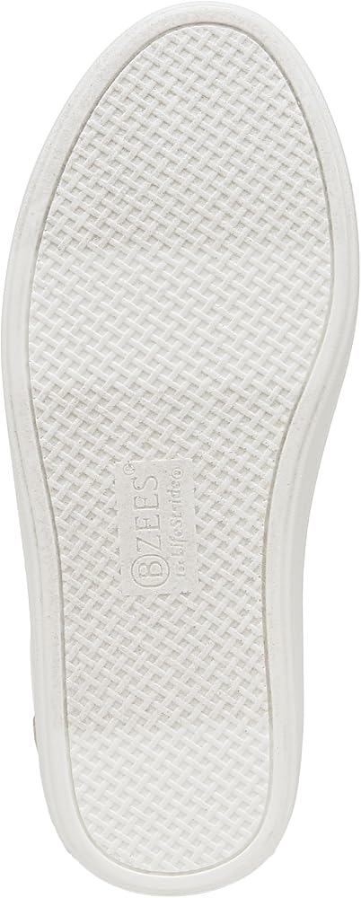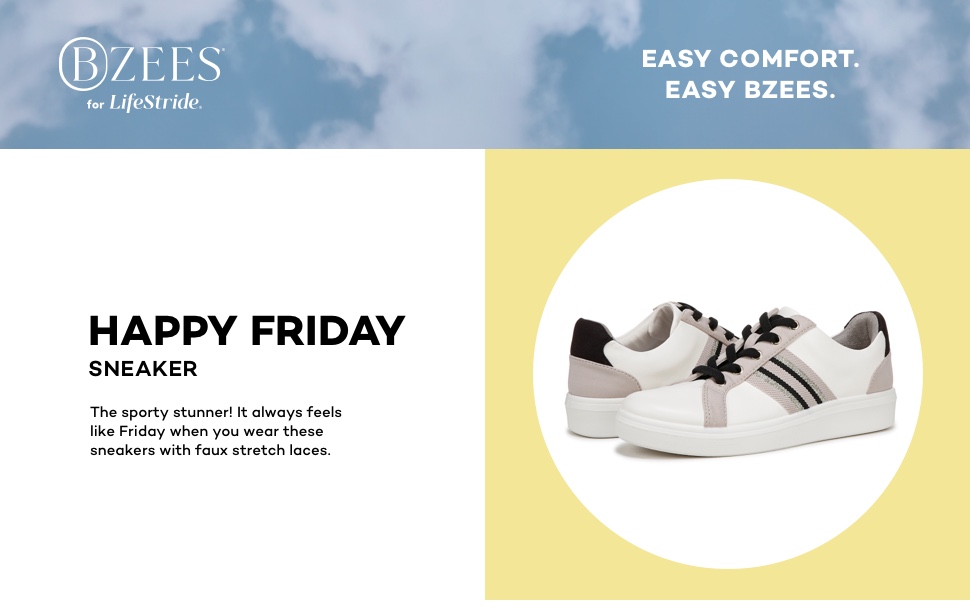 The sporty stunner! It always feels like Friday when you wear these sneakers with faux laces. Stretch synthetic, synthetic/rhinestone or synthetic/webbed upper with partially recycled back counter and a round toe. BLOOM™ materials: Eco-conscious algae-based foam layer under the insole. BZEES Cloud Technology: Designed so you'll feel weightless, energized and free. Ultra Lightweight: Step lightly with a nearly weightless feel. Dynamic Stretch Fabrics: Move freely in shoes with built-in stretch. FreeFoam™ Comfort: Low pressure insoles with maximum foot contact and cushy arch support. ComfortBlast Foam: Our most premium foam with unbelievable rebound, luxe cushioning, and comfort that never quits. SoCush arch support. 1/2 inch heel. Machine Washable: Wash on cold and air dry.