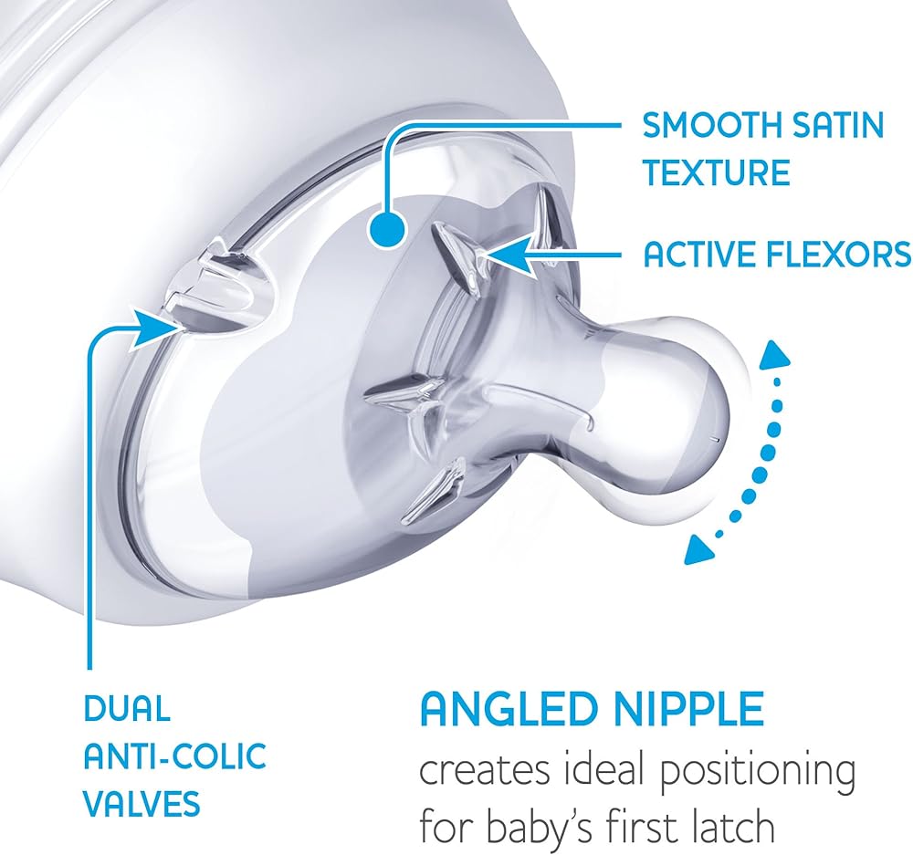 Both the angled design and soft-as-mom's-skin materials ensure a more comfortable fit in baby's mouth. Flexors at the base of the nipple help prevent nipple collapse and allow the same natural sucking motion baby uses on the breast. The angled design also promotes an ideal feeding position and ensures the nipple stays full of milk.