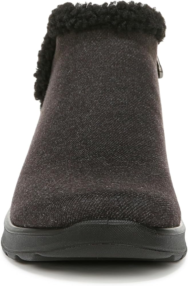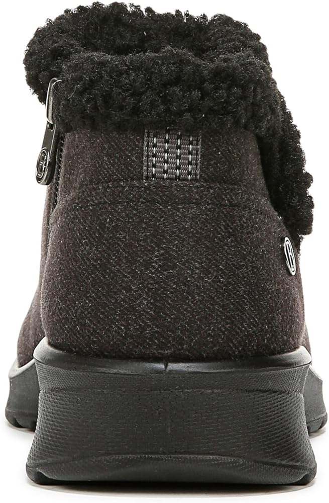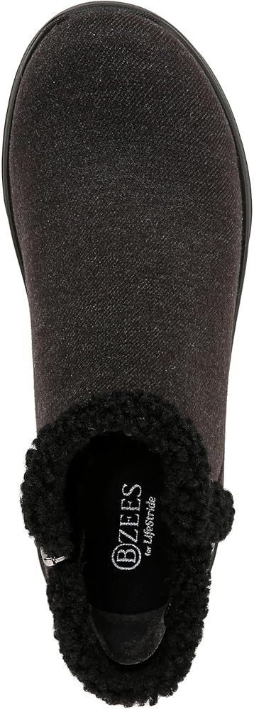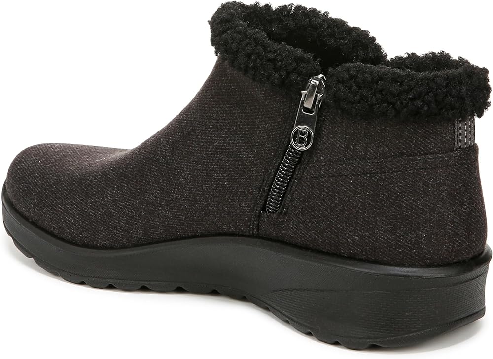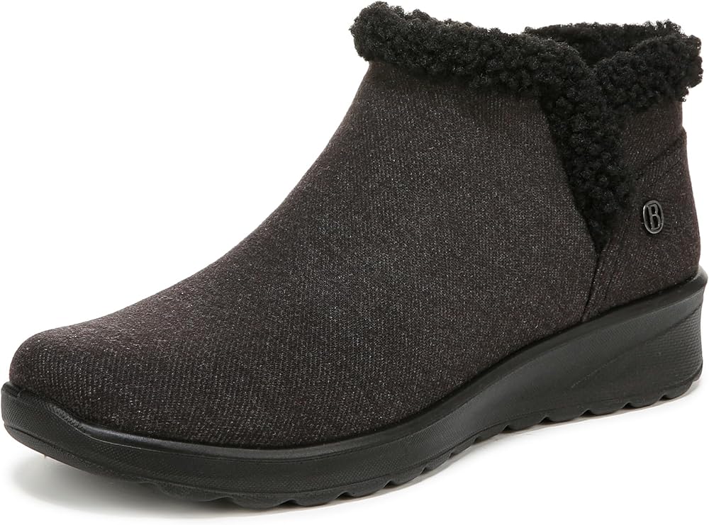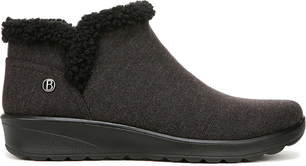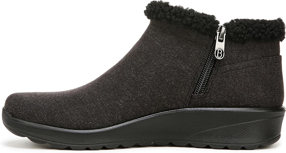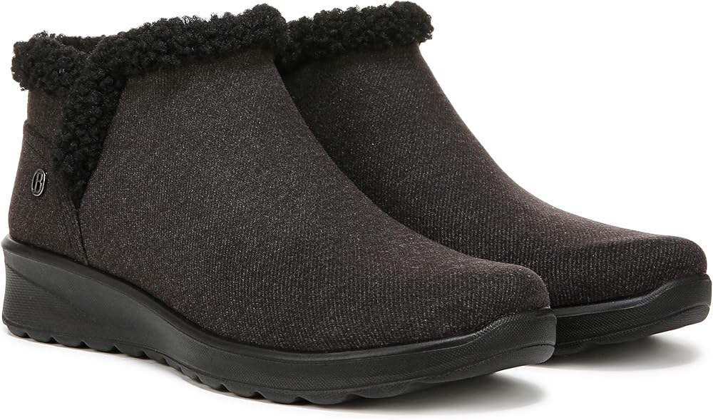 Stay cozy, stay clean! Say hello to the machine washable boots with a fuzzy touch. You'll never meet an ankle bootie quite like these. Stretch twill fabric upper with partially recycled linings and top cloth with a round toe. Side zipper and cozy collar. BLOOM™ materials: Eco-conscious algae-infused foam layer under the insole. BZEES Cloud Technology: Designed so you'll feel weightless, energized and free. Ultra Lightweight: Step lightly with a nearly weightless feel. Dynamic Stretch Fabrics: Move freely in shoes with built-in stretch. FreeFoam™ Comfort: Low pressure insoles with maximum foot contact and cushy arch support. 2.87 inch boot height, 10.24 inch leg circumference. 5/8 inch platform, 3 1/8 inch wedge heel. EVA outsole. Get Width It: Countless pairs of Bzees come in wide width shoes for women. Machine Washable: Wash on cold and air dry.