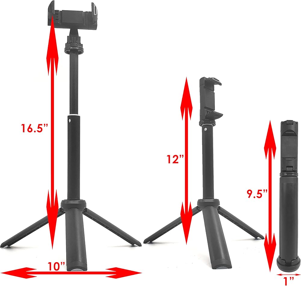 حامل ثلاثي القوائم قابل للتمديد للهاتف أو كاميرا الويب مقاس 16.5 بوصة، قابل للوضع الرأسي والأفقي وقابل للتعديل ليصبح مسطحًا أو 30 درجة مع دوران 360 درجة، صغير محمول 9.5 بوصة للحمل في الهواء الطلق.