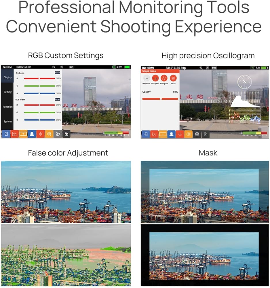 أدوات مراقبة احترافية، تجربة تصوير مريحة، RGB مخصص مدمج، مرشح، لون زائف، نسبة بصرية مشوهة، قناع، ووظائف أخرى. مراقبة دقيقة للشكل الموجي لسهولة الوصول إلى جميع معلومات إشارات الفيديو والصوت.