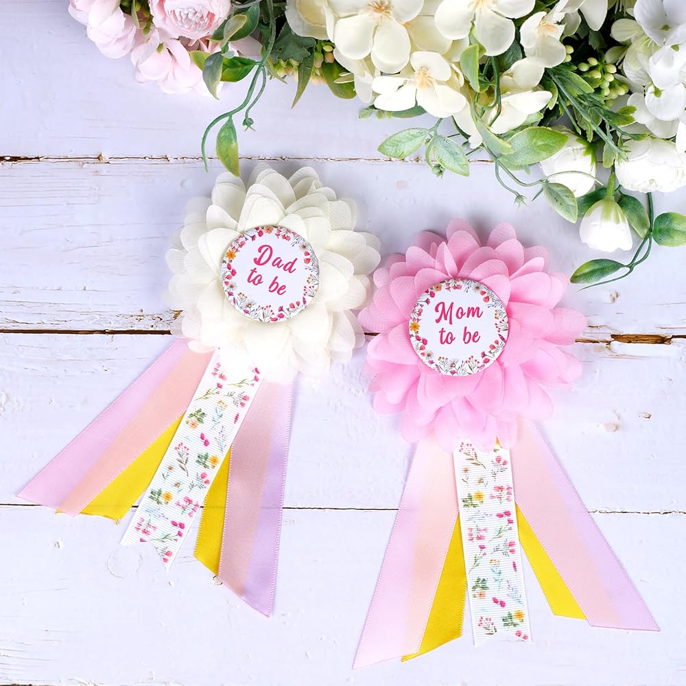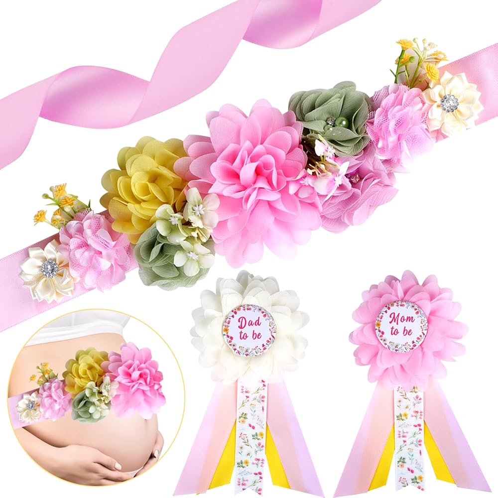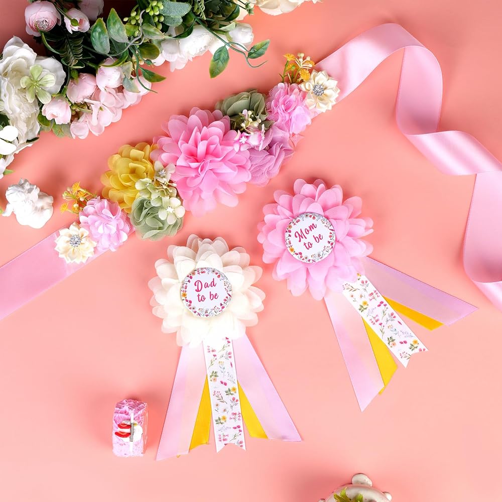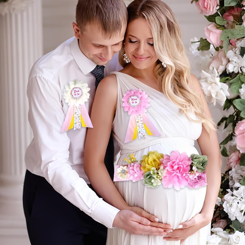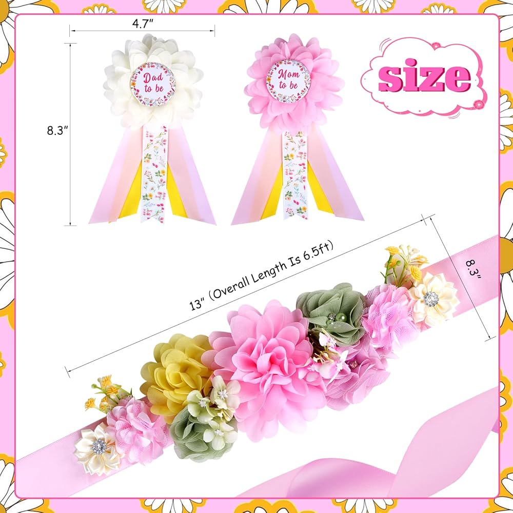 Wildflower Sash & Corsage Set: Includes 1 beautifully designed wildflower theme maternity sash, 1 mom to be corsage pin and 1 dad to be corsage pin. The exquisite maternity sash is pre-assembled and ready to use.