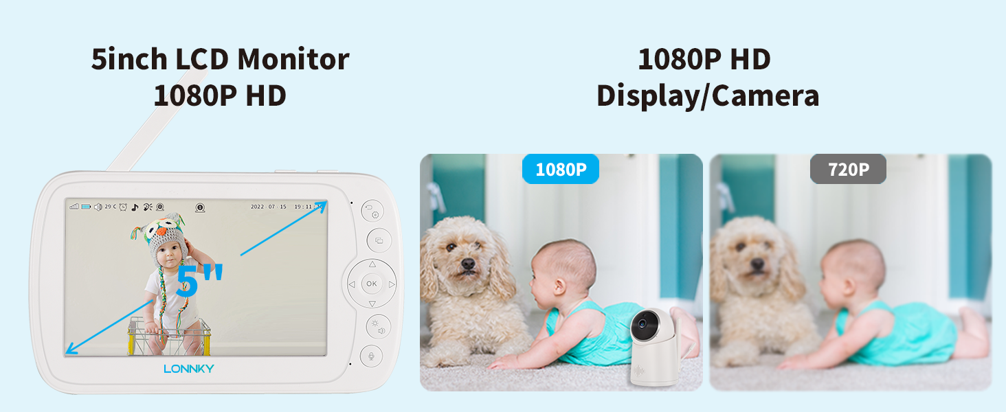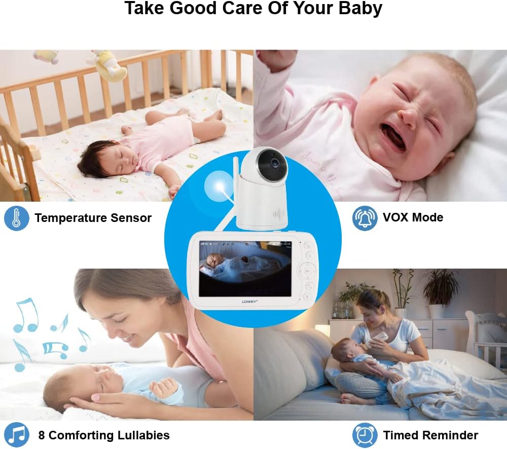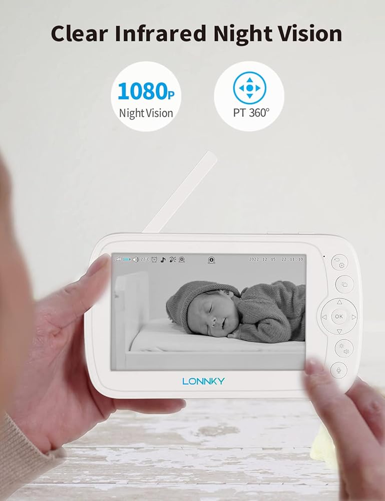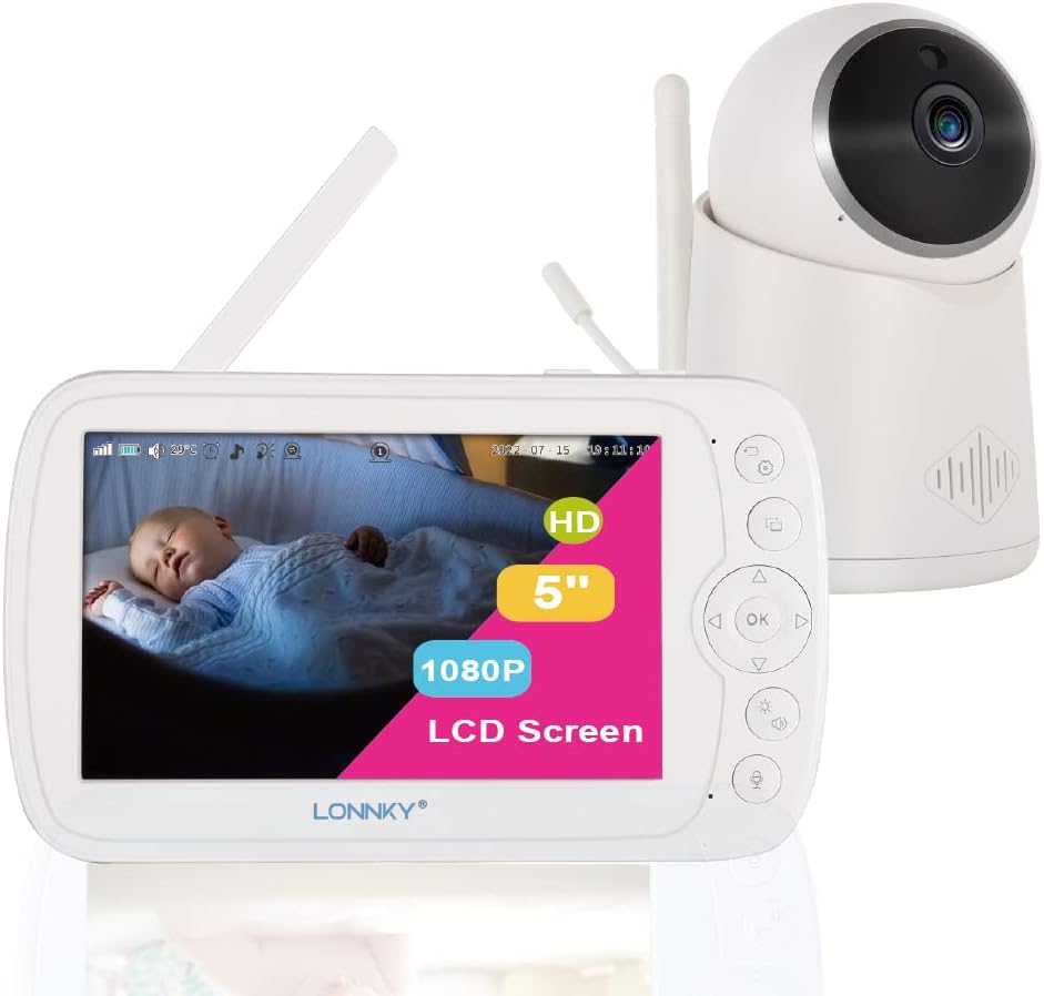 جهاز مراقبة الأطفال LONNKY مع كاميرا وصوت، شاشة ملونة مقاس 5 بوصات مع كاميرا 1080P Pan 355 درجة/إمالة 65 درجة، صوت ثنائي الاتجاه، رؤية ليلية 16 قدمًا، إنذار درجة الحرارة والصوت، نطاق يصل إلى 1000 قدم، دعم التشغيل