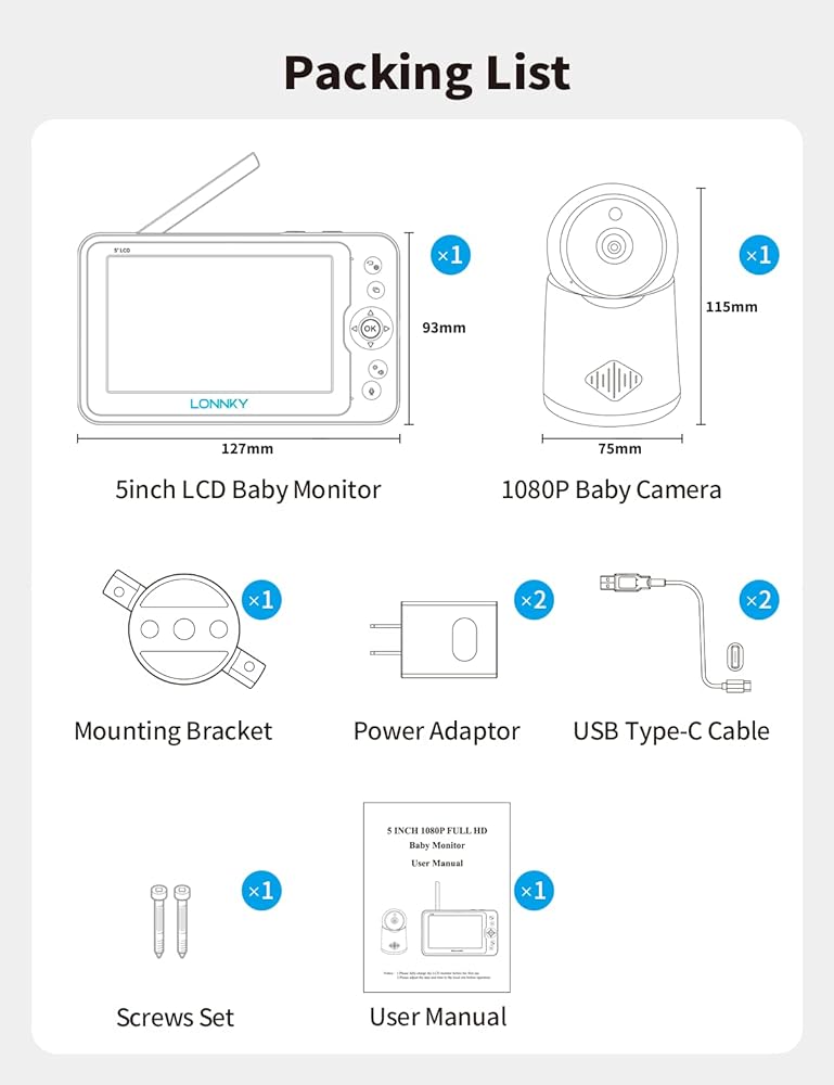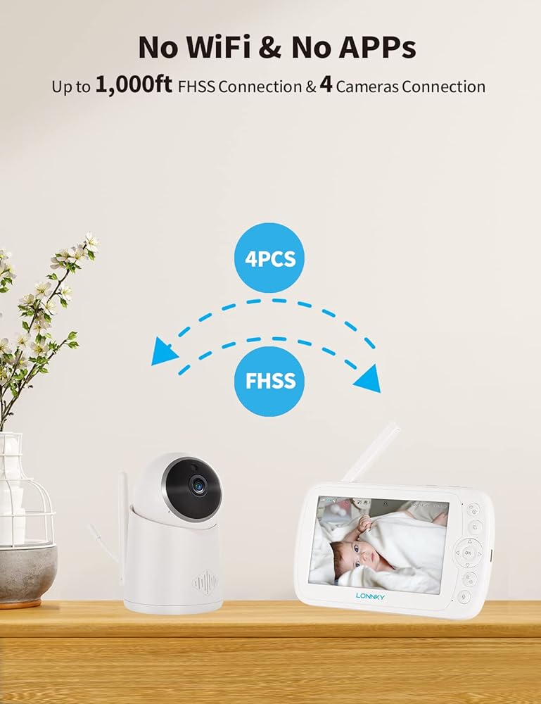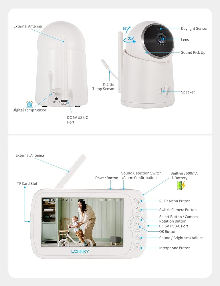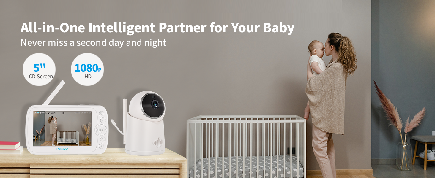 جهاز مراقبة الأطفال LONNKY مع كاميرا وصوت، شاشة ملونة مقاس 5 بوصات مع كاميرا 1080P Pan 355 درجة/إمالة 65 درجة، صوت ثنائي الاتجاه، رؤية ليلية 16 قدمًا، إنذار درجة الحرارة والصوت، نطاق يصل إلى 1000 قدم، دعم التشغيل