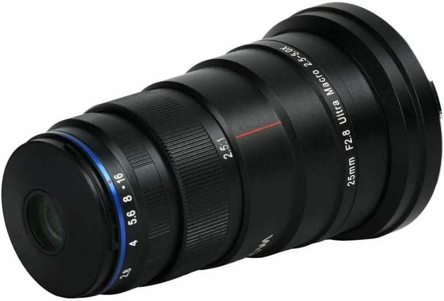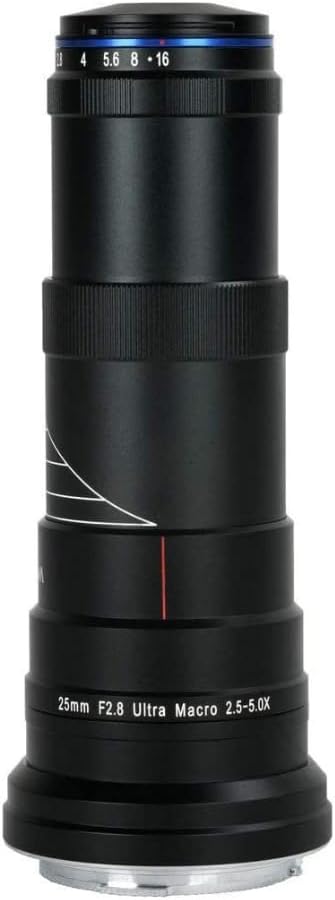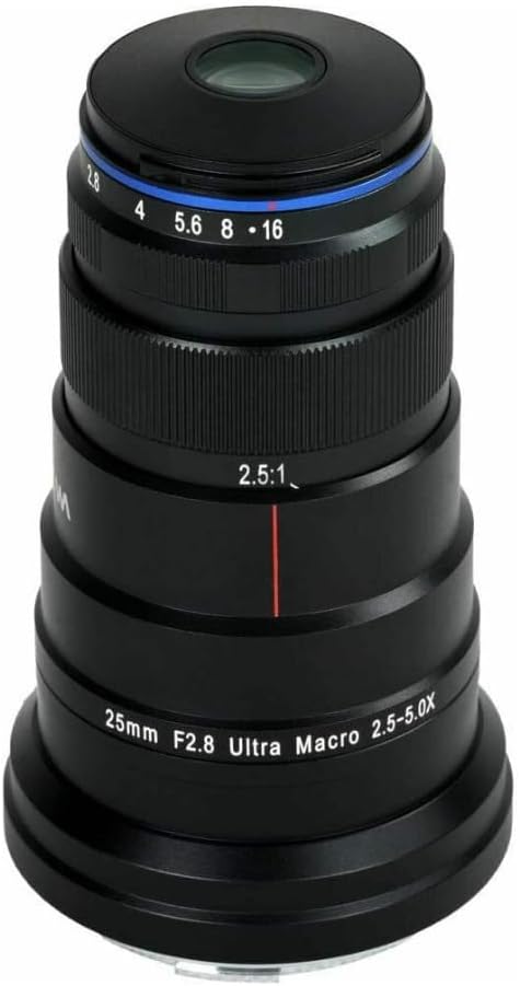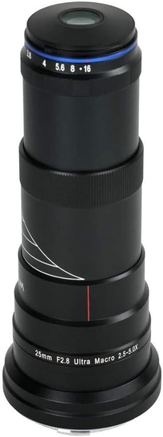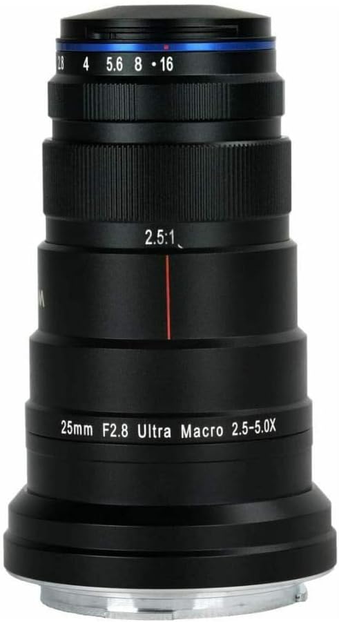 • Versatile: The Venus Laowa 25mm f/2.8 2.5-5x Lens is the most compact and versatile high magnification macro lens. This lens is optimized for macro shooting between 2.5-5x life-size. The lens is specially designed with an extended working distance (45mm at 2.5x and 40mm at 5x) and a small lens barrel