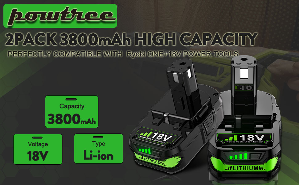 POWTREE ترقية 3800 مللي أمبير 18 فولت P102 بطارية ليثيوم بديلة لبطارية Ryobi 18 فولت Ryobi ONE+ P107 P108 P103 P104 P105 P106 P109 P122 أدوات كهربائية لاسلكية 2 حزم