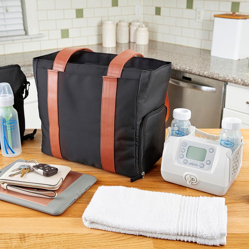 Carry it all through every season with the functional and classic, Dr. Brown's Breast Pump Carryall Tote. Whether you're pumping on the go, packing up the diaper bag, or taking some much-needed mom time, The Carryall Tote bag has space and style for any version of you! The Breast Pump Carryall Tote fits most electric pumps and has the pockets to organize everything. From baby bottles, pacifiers, diapers and wipes to snacks, water bottles and laptops, there's an organized place for a day out of the house. Keep small items like your wallet, keys and phone safely stored away in the zipper pocket. When you're done pumping, use the space to store your yoga mat or beach towels. Choose from two classy color schemes, sleek grey with black trim or modern black with leather-like trim. Match any season, situation – or look!